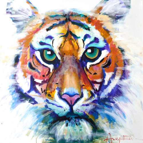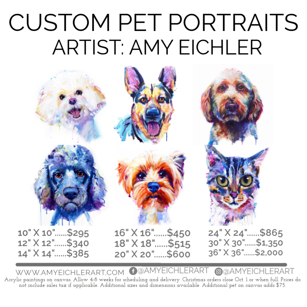 Acrylic painter and artist Amy Eichler is inspired by colorful figures, animals, and anything with eyes and a personality. Her background in dance has influenced her work to emphasize expressive color, movement, and character of the living form. Most often incorporating an alla prima approach with a limited color palette of 3-5 paints, Amy pushes color in nature to their most saturated, richest hues and uses contrast and negative space to place emphasis on the subject of her paintings. Amy was born and raised in Northwest Arkansas where she holds a degree in Art from the University of Arkansas and currently operates as a full-time artist. Her offerings include her original acrylic paintings, custom paintings (including pet paintings), canvas prints of her artwork, and animal/human portrait painting workshops for all levels. Her artwork can be found in galleries, retail shops, and various online stores including her website www.amyeichlerart.com.