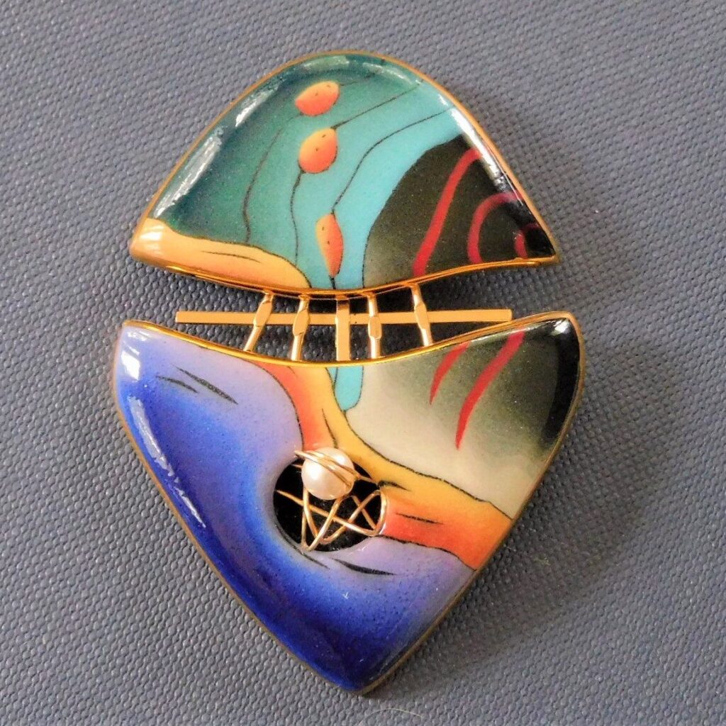 Our design technique uses the ancient Japanese technique called nerikomi. We begin by making our own porcelain clay from a personal recipe and adding commercial stains to create our colors. These colors are then combined, shaped, sliced, and layered to form a log or loaf. Each piece of jewelry is sliced from the wet log and then shaped into whatever we’re creating. After that, each one is then kiln-fired to 2200 degrees F, after a clear glaze is applied. The last and final firing is at 1300 degrees after a 24-karat gold edging is applied to each one. We are then able to attach components to each piece to complete them as a wearable art form.