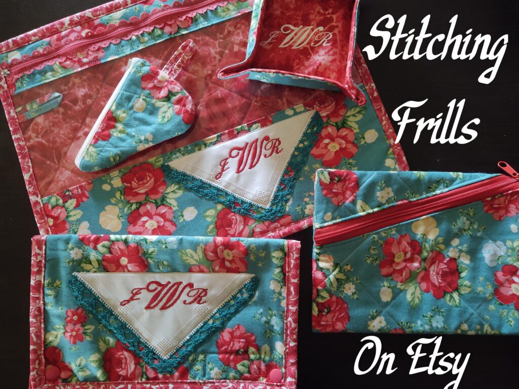 Stitching Frills project bag designs showcase a vintage crocheted handkerchief monogrammed with your initials. Originally used for identification on linens, items with monograms began to symbolize something that was cherished. Giving someone an item with a monogram symbolizes the ultimate compliment. As all my items are handmade, no two items are exactly alike. There are various combinations of fabrics and with the addition of a vintage crocheted handkerchief including your monogram, the items you purchase will be unique.