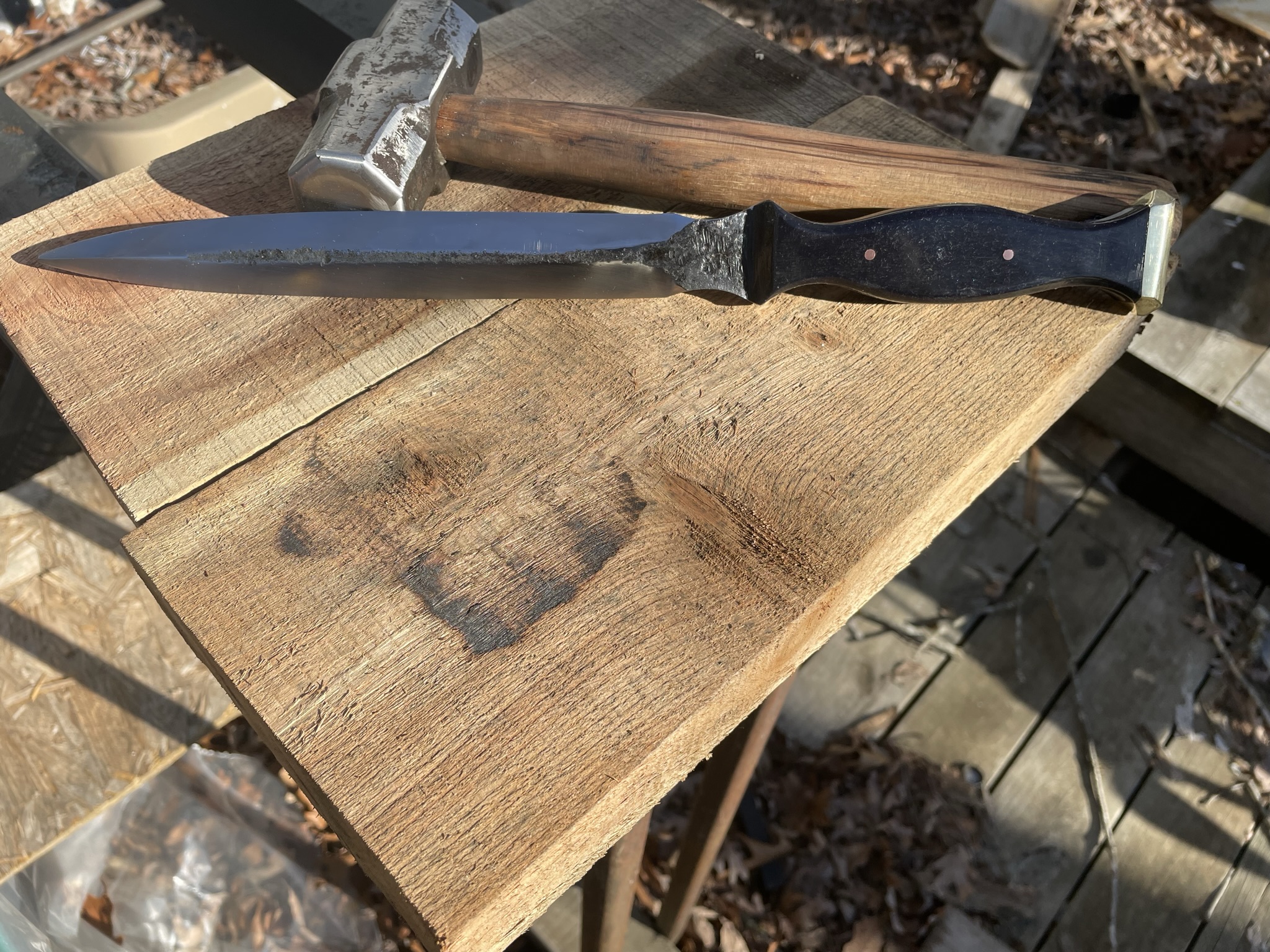 Braized brass pommel and full 1/4 inch thick, 1 1/2 inch wide blade, hand forged hammered and ground all by eye !!
