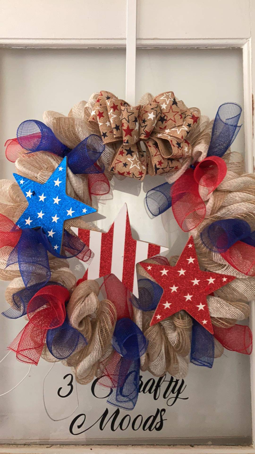 22 inch wreath with deco mesh of red blue and burlap to give it that farmhouse look. Accented with stars across the center.