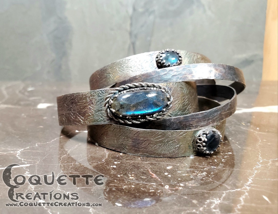 This original design, one-of-a-kind set of five (5) .999 fine Silver cuff bracelets is hand hammered and formed by Karen. Hand forged jewelry can have slight imperfections or flaws as this is the nature of items that have been crafted solely by hand. The set features 3 gorgeous Blue Labradorite stones set in sterling silver bezels, the larger surrounded by braided silver wire. You have several choices of how to wear these bracelets: you may choose to wear all 5, or choose to wear only 1; you may wear just the 3 with stones, or just the 2 plain bracelets; or any combination in between.