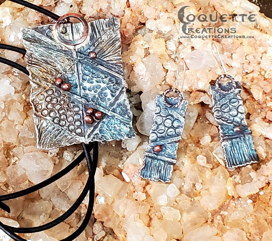 An original design created by Karen, one-of-a-kind .999 fine silver pendant, hand cut, textured and forged. The pendant is embellished with small Copper orbs. The pendant was torch fired and hand textured by hammer. The cord is black leather and can be adjusted shorter or longer by sliding the knots. There is also a set of silver earrings that matches the attributes of the pendant, created in the same manner. An antiqued patina was applied to the silver and it was sealed.
