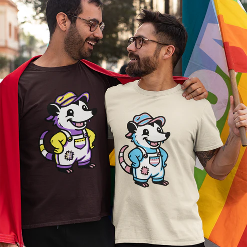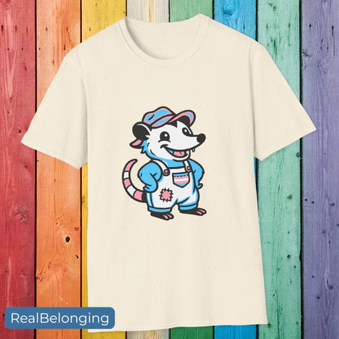 Choose the bold 12″ centered design or the smaller 4″ chest version for a more subtle look. Whether at Pride or at the cookout, this possum is here to remind everyone: trans pride belongs everywhere. Even down home and in the holler.