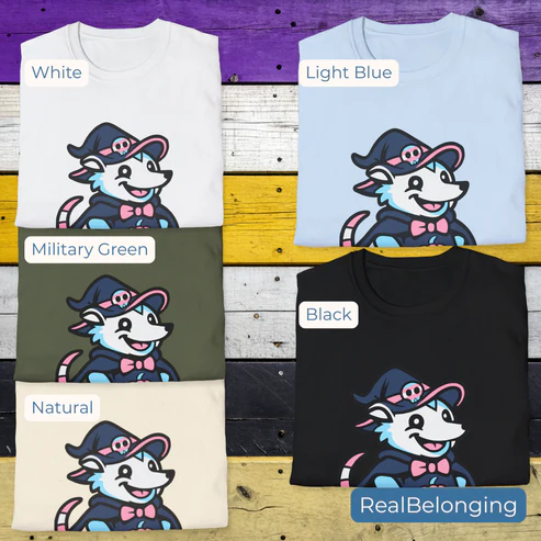 Celebrate trans joy with the Adorable AF Transgender Witch Possum T-shirt! This hand-drawn witch possum sports soft transgender pride colors, broom in paw, casting whimsical spells of queer positivity. Designed by a rural trans artist, proceeds support mutual aid for trans folks in the U.S. South. Soft, comfy, and perfect for Halloween, fall festivals, or everyday cozy wear — a subtle and affirming statement of real belonging.