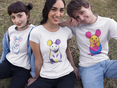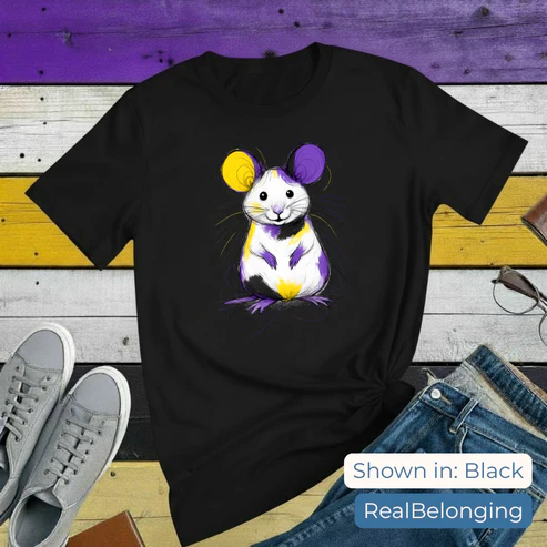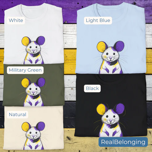 Celebrate self-expression and non-binary pride with the Non-Binary Mouse T-shirt! Soft, comfy, and perfect for school, work, or everyday adventures, this unisex tee features an adorable mouse in non-binary pride colors.