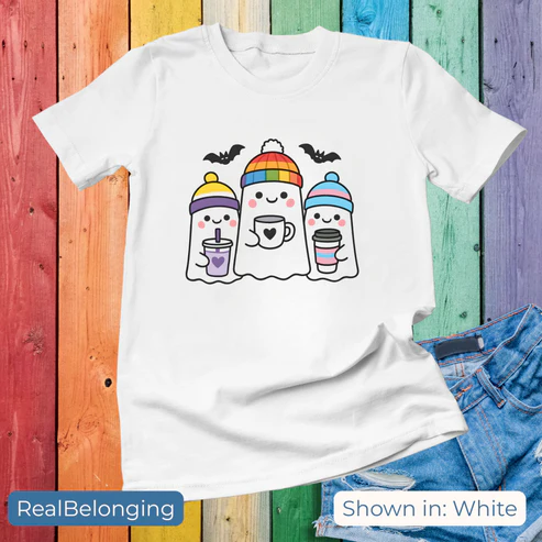 Celebrate LGBTQ+ joy in every season with this Adorable Queer Ghosts tee! Three playful winter ghosts sport non-binary, rainbow, and transgender pride hats while sipping cozy drinks, blending festive whimsy with queer visibility. Soft, comfy, and perfect for Pride events, Halloween fun, or everyday wear — this shirt is a cheerful reminder that everyone belongs.