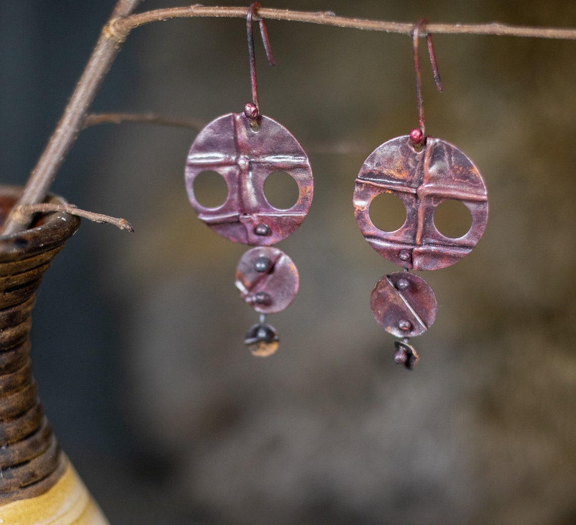 Solid Copper fold formed earrings with aged patina. @ inches long, 1 inch wide