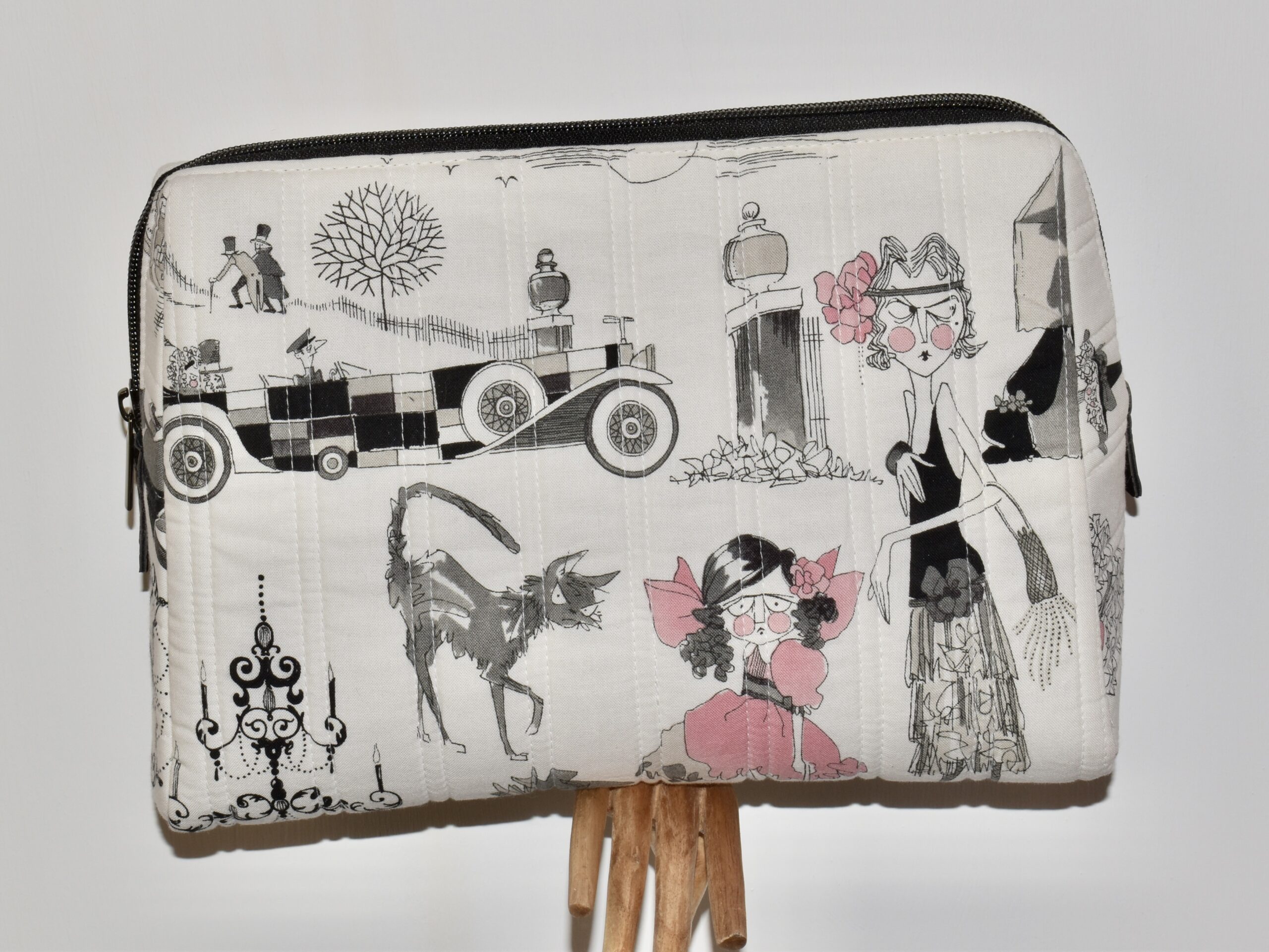 Handmade quilted cotton fabric pouch. The interior is a black, pink and white large polka dot print.