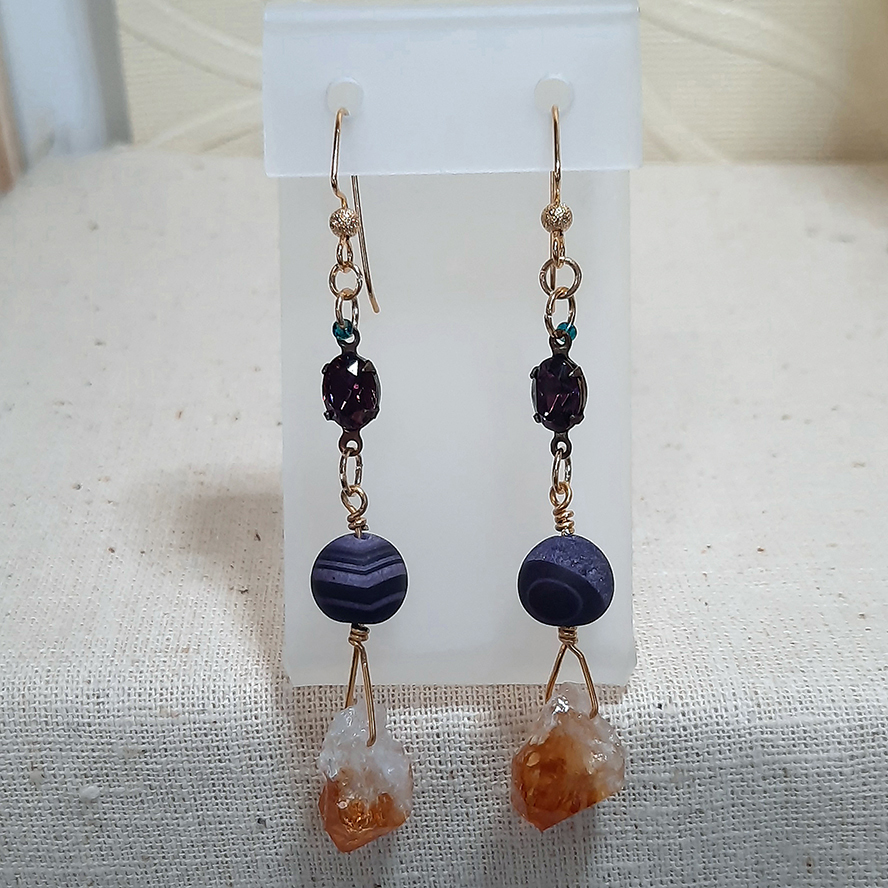 I like the juxtaposition of textures & styles of these pieces of amethyst. The rough nugget is yellow amethyst. Matte finish on a purple sphere & a vintage rhinestone in purple amethyst color make this unique stacked earring.