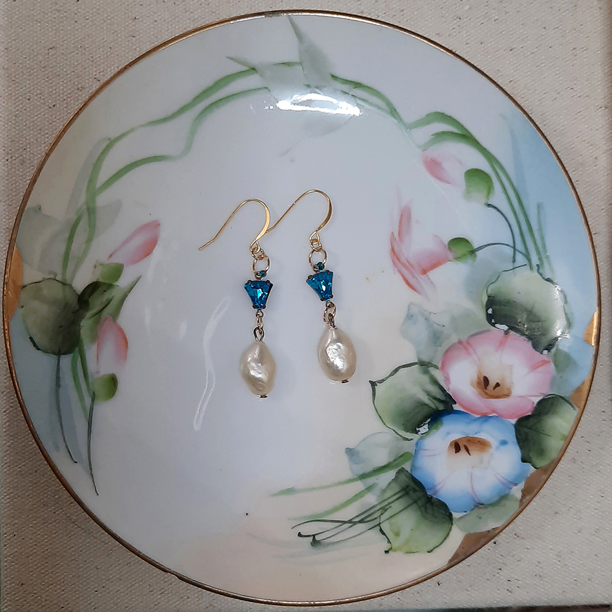 Vintage two ways in these earrings. The rhinestones are vintage store stock that I purchased for the 2020 Earring Extravaganza. They share with vintage costume jewelry pearls that I found in a flea market in a bag of broken jewelry.