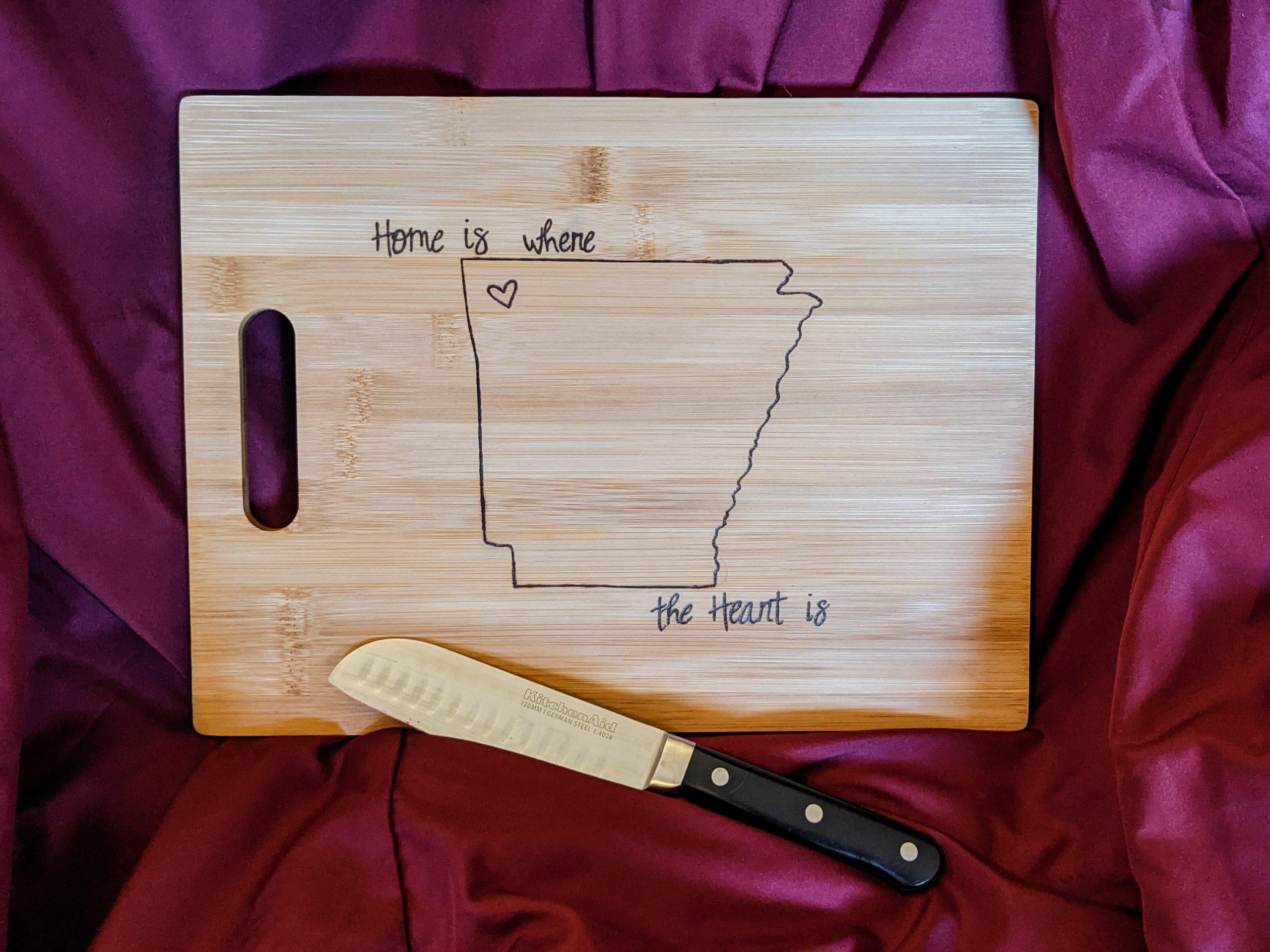 A light-weight bamboo cutting board or chopping block for regular kitchen use. This board highlights our beloved home, Northwest Arkansas, hand-drawn and burned into the board by Mel. The images displayed show the board in different settings and light conditions.