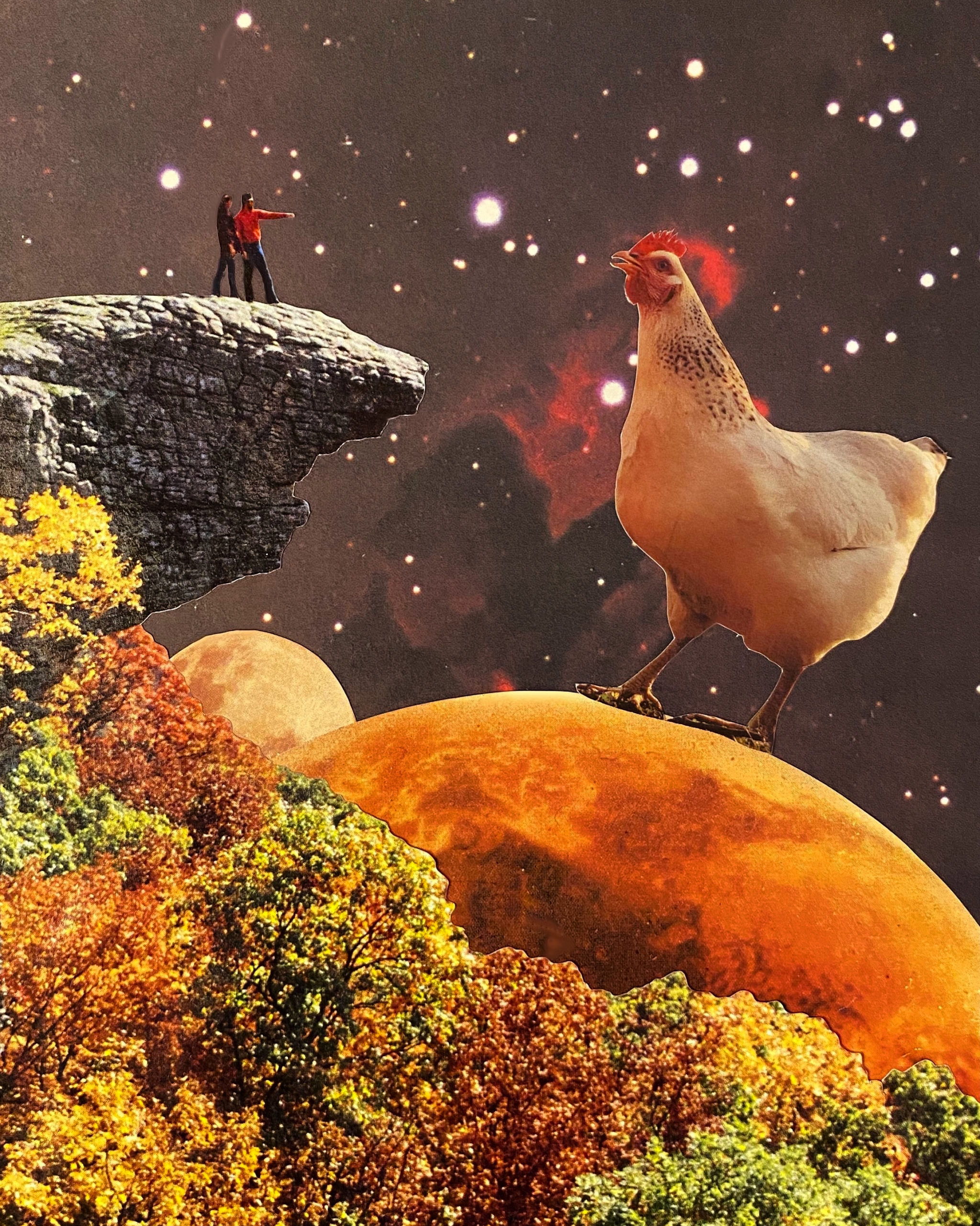I’ve been making analog collages for about 7 years. I love being able to cut out images from multiple sources and paste them together to create my own little world. Some of my favorite materials are sparkly paper, Hubble telescope images, and 1960s National Geographic magazines.