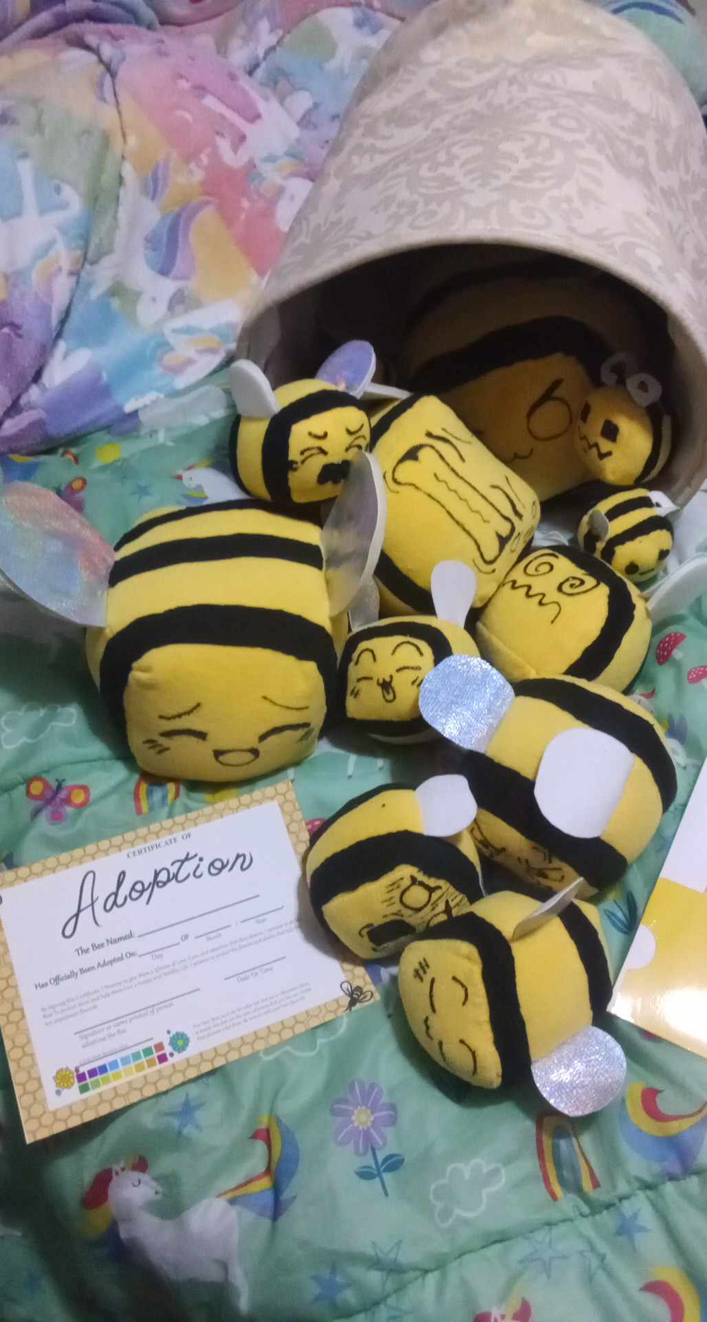 Fun whimsical bee plushies, that support bee conservation, part of the funds go to bee preservation and helping the planet.
