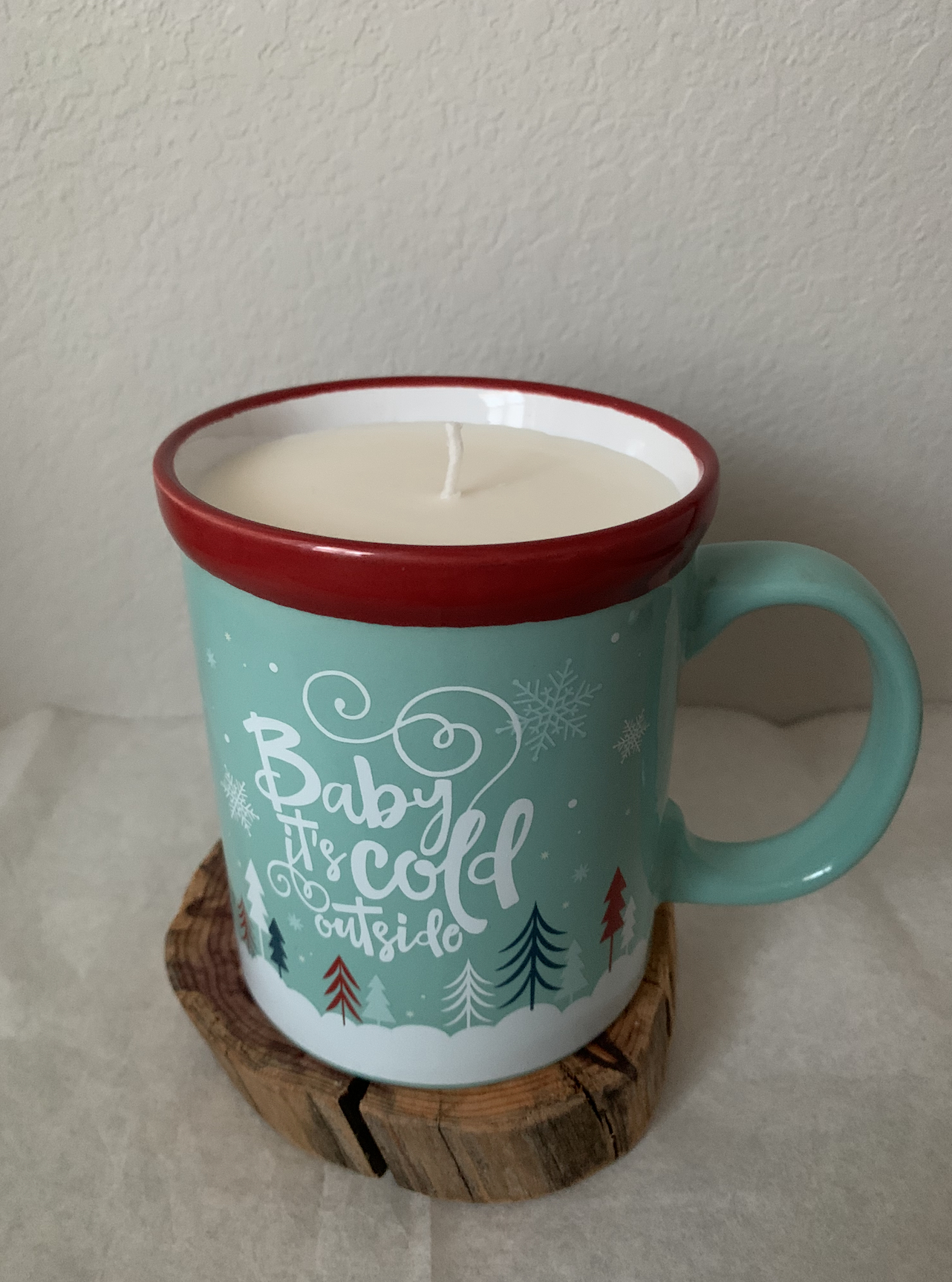 16oz soy mug candle in a teal “Baby it’s Cold Outside” mug, scented with Vanilla and Hazelnut.