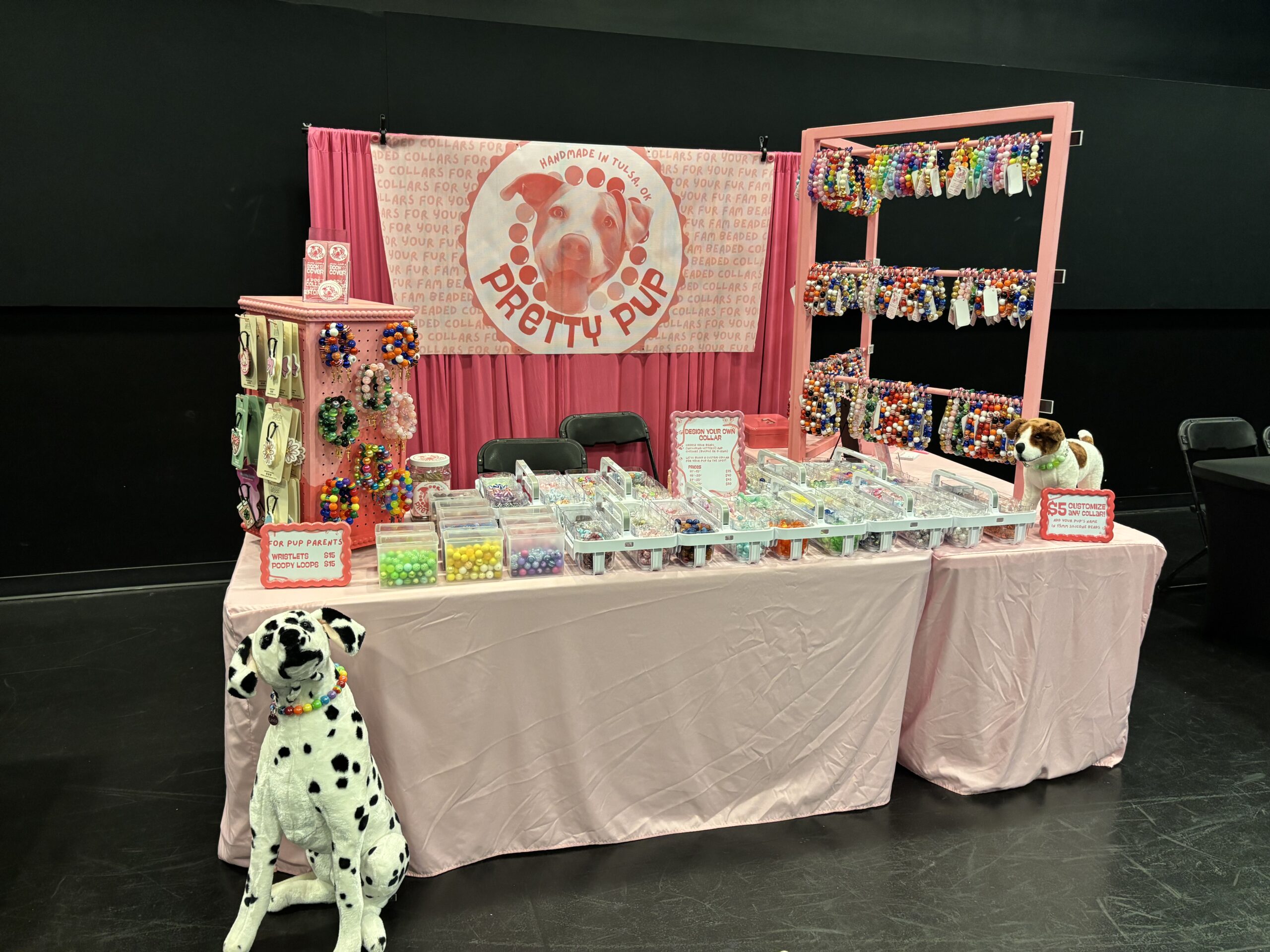 I ordered extra beads because I wasn’t sure how many it would take and used them to make collars for my friends’ and family’s dogs and then kept making collars. It was a good way to keep busy in the grieving process. With about 400 collars now in my house, a maker friend encouraged me to apply for a vendor market and I did. I got my booth display in order (all pink to honor Adeline’s memory) and had a really successful first show!