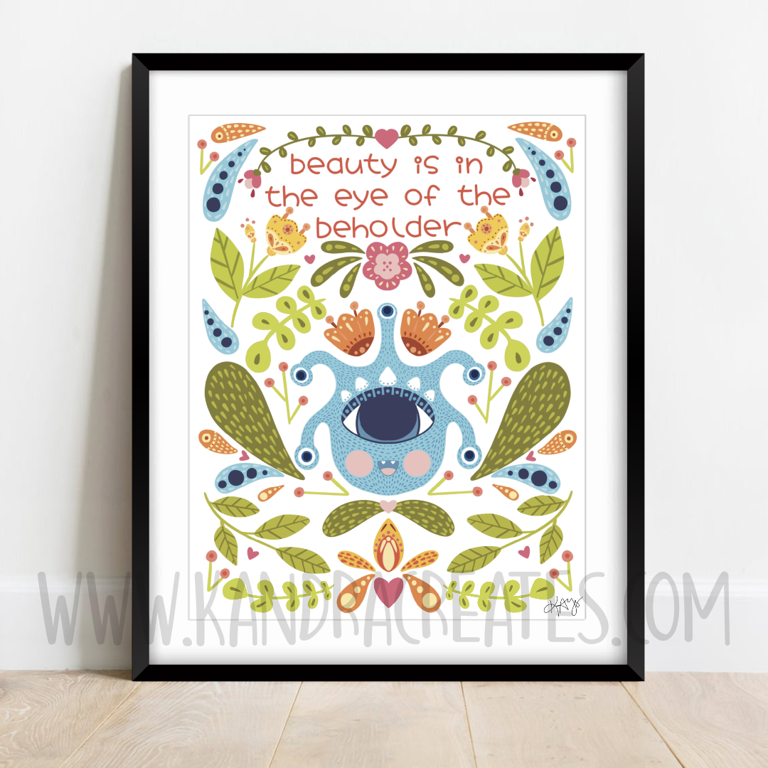 This artwork features a beholder from the Dungeons and Dragons Monster Manual with the saying “beauty is in the eye of the beholder” in a modern folk art style. The perfect print for those that love the tabletop RPG.