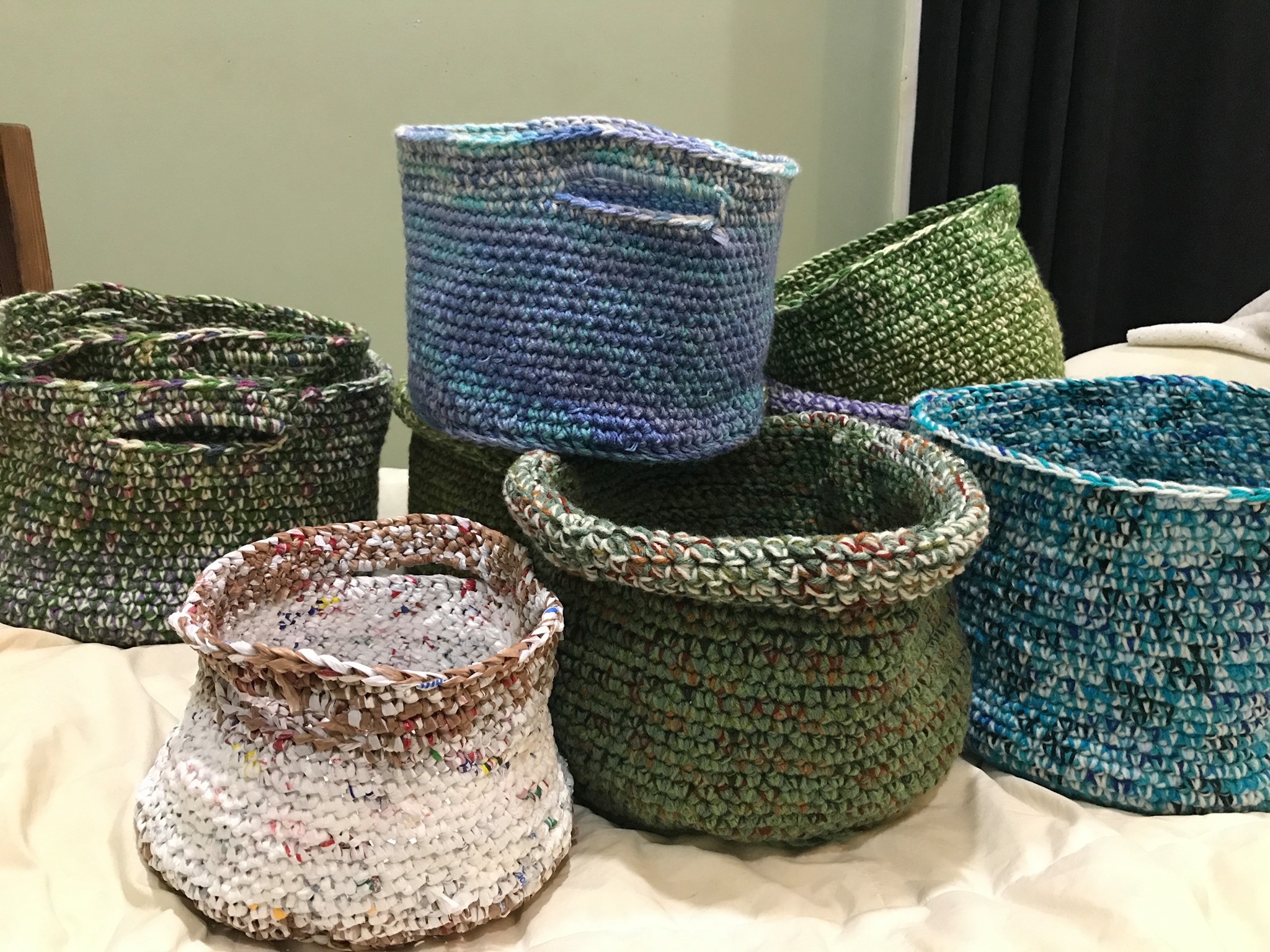 These are larger baskets – they vary in size, but most are around 11″ x 11″. Some have handles and some rolled tops. Baskets vary in color combinations. Baskets are rugged, made with 3 ply acrylic yarn. They can be used to hold a variety of items: leggos, towels, car junk, I use them as pot holders for my big soup pot, potted plant covers, newspapers, toilet paper, toys, clothes……The list is endless. Custom orders accepted. Contact maker for baskets currently in stock since inventory rotates and I make what I feel like and the colors that are itching to be used any given day.
