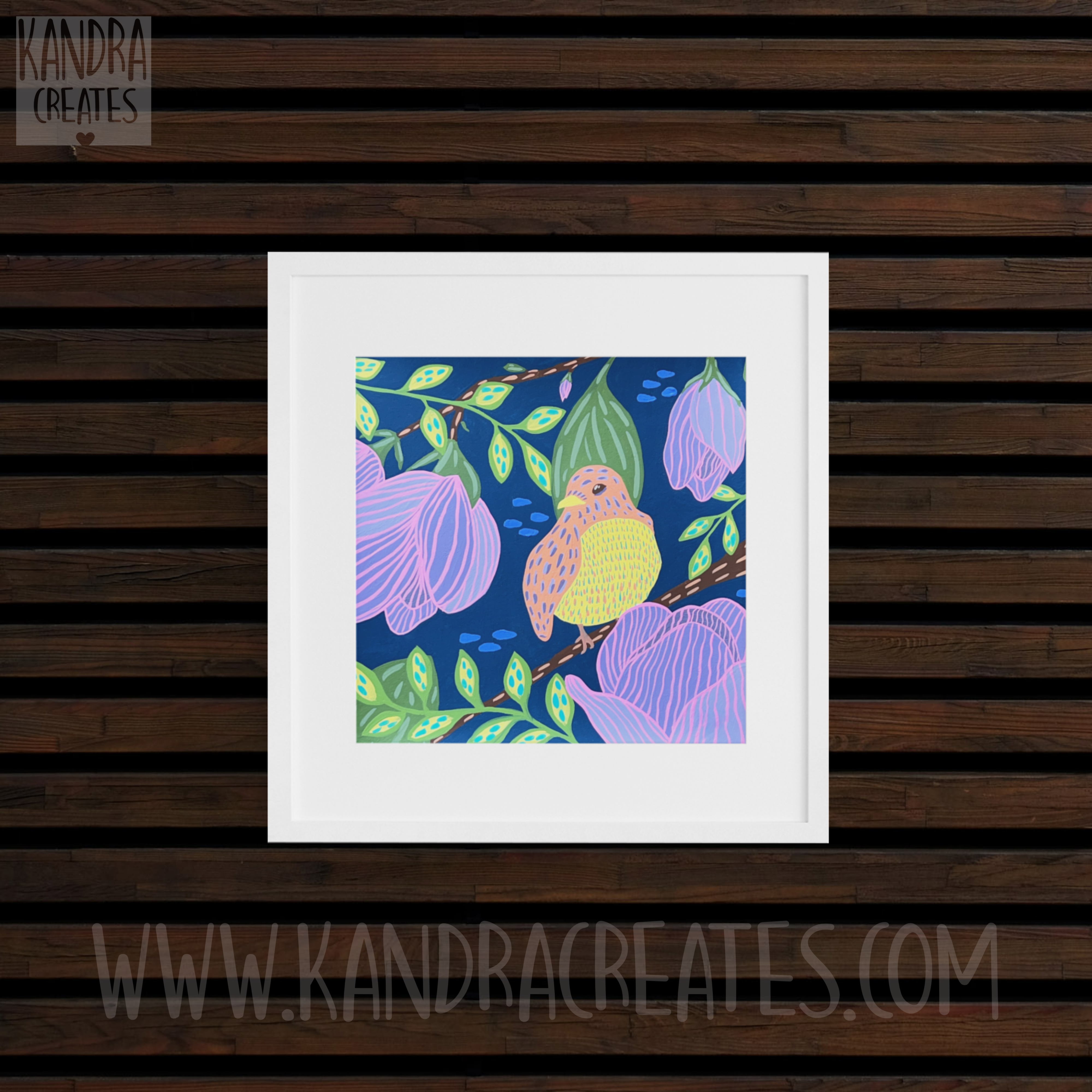 This original artwork by Kandra Young was created in 2021. It features a bright orange and yellow colored bird surrounded by purple and pink florals. This painting is 8 inches by 8 inches, painted with Winsor & Newton Designer Gouache on hard-pressed paper. It has been coated in a wax medium for protection.
