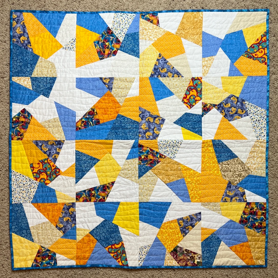 This is a blue and yellow crazy quilt pattern lap quilt measuring 38×38 inches. The fabric and batting are 100% cotton.