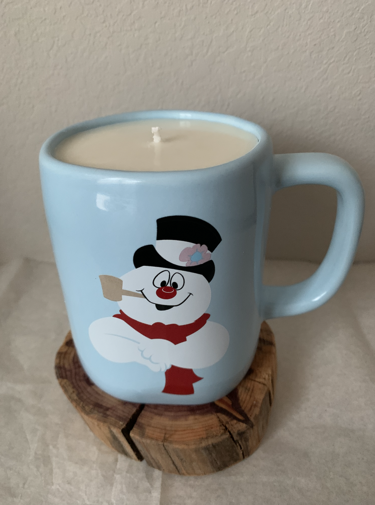 16 oz blue Frosty the Snowman mug candle with Vanilla and Hazelnut soy wax.