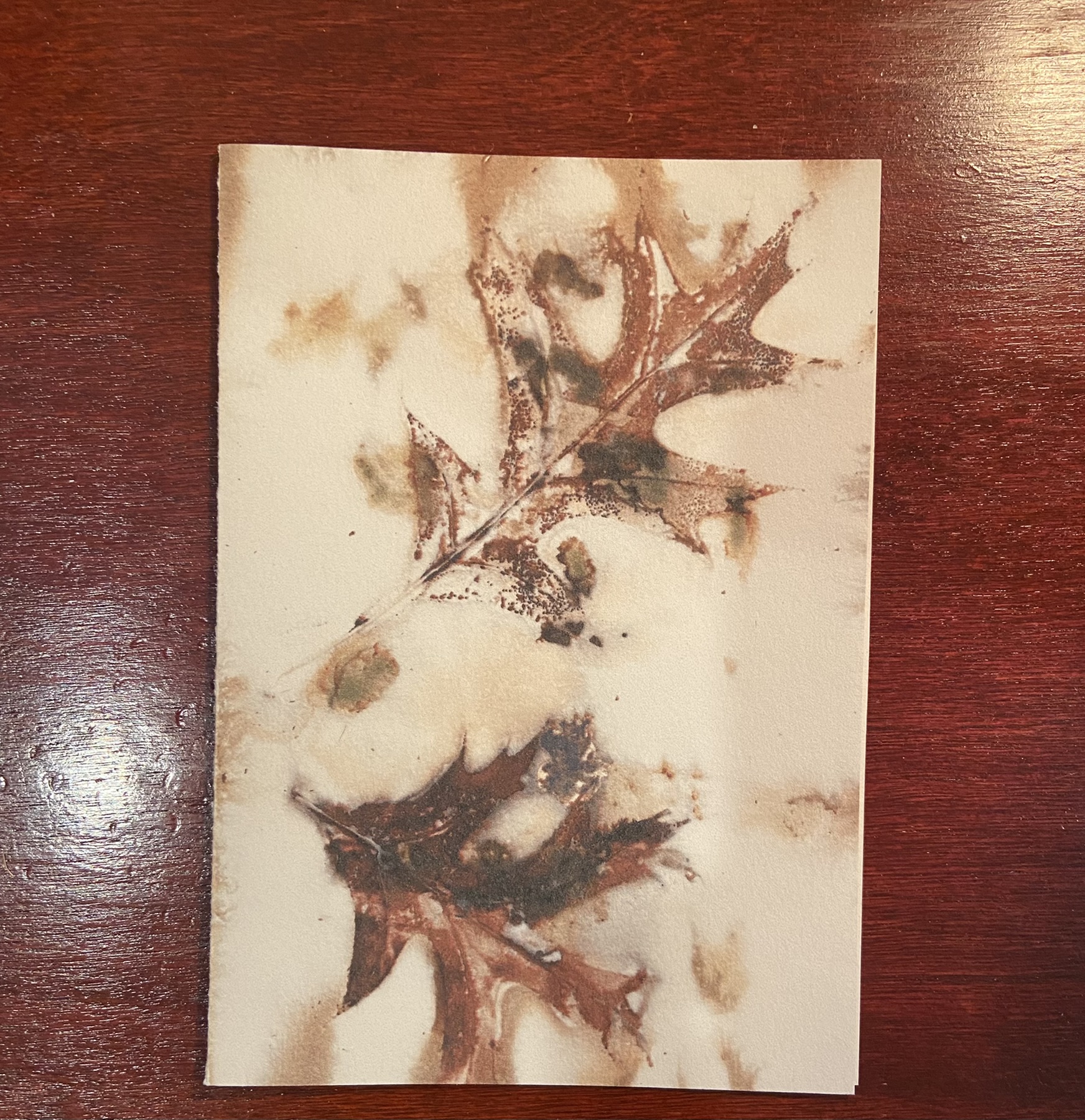 5″ x 7″ Greeting Card made from reproductions of my eco-printed papers. Eco printing is a form of moisture and heat contact printing of the natural pigments, tannins and acids present in plant materials. The cards are printed on acid-free heavy weight paper. Card is blank inside and comes with envelope.