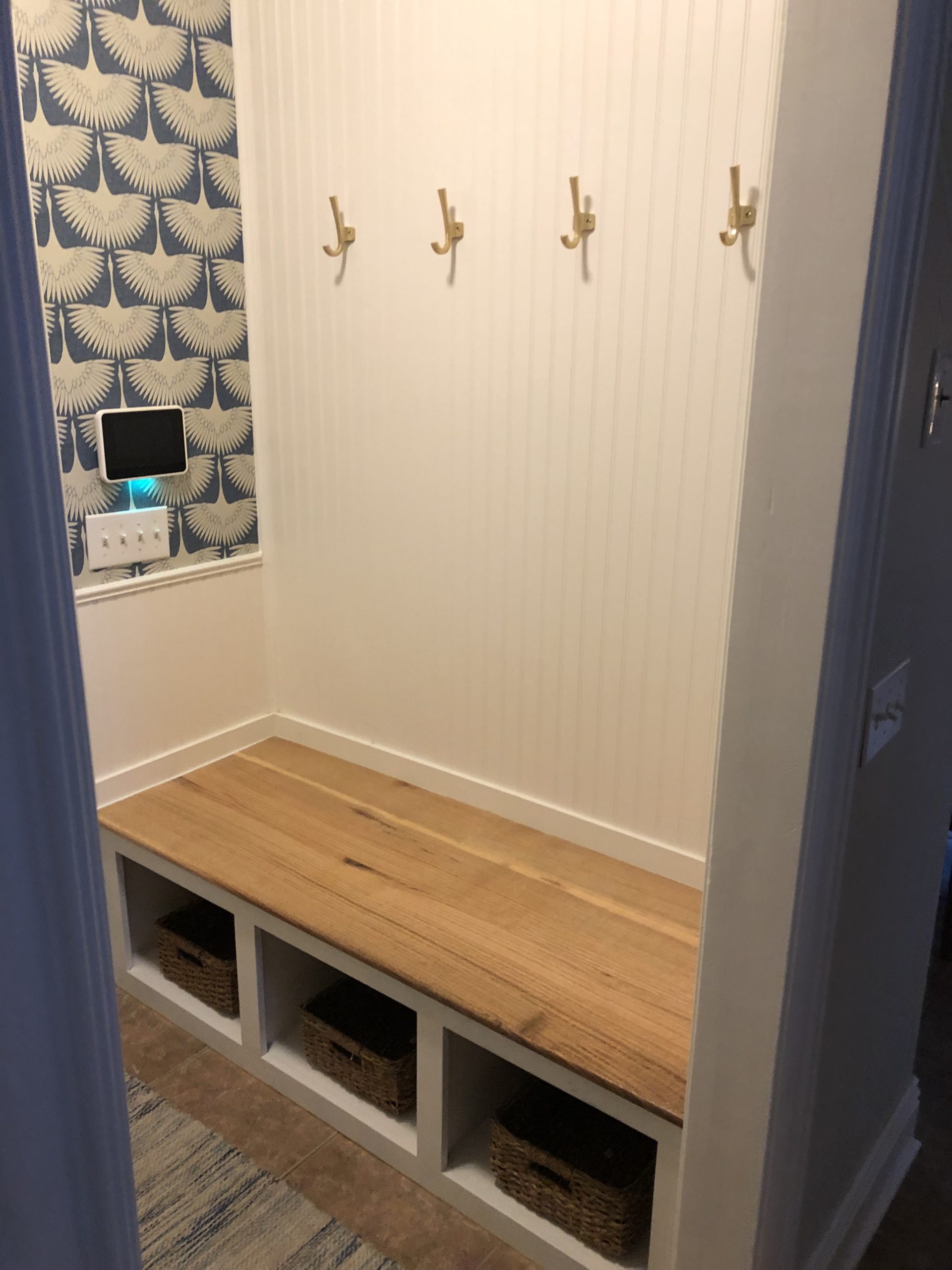 Custom built-in entry or mud room bench. This exact bench had a top made from quarter sawn white oak finished with a clear danish oil. There are several design options with benches. They can have cubbies for baskets like this one does, or it can have a solid front with a seat that lifts open for hidden storage. There can be coat hooks like this one and even cubbies added above the hooks. Contact us today to see what we can do!