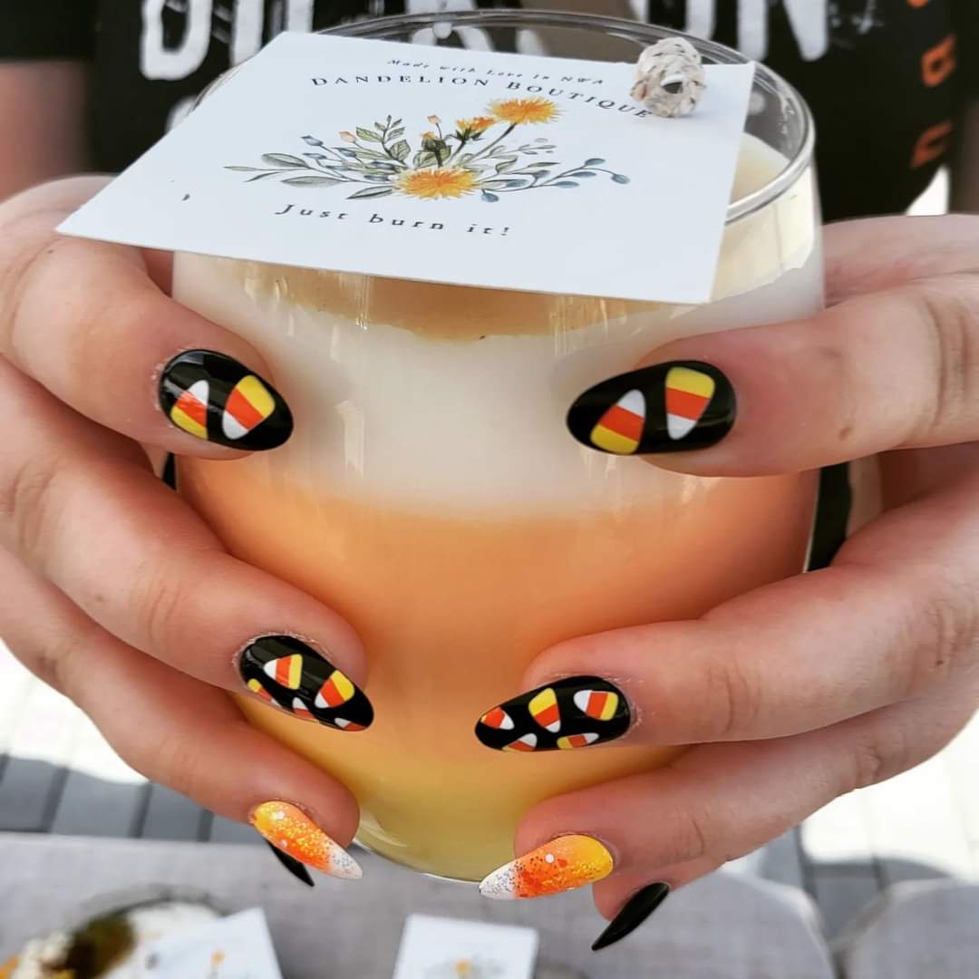It’s CORN! Candy corn that is! The wonderful traditional candy turned into a beautiful candle for the spooky season.