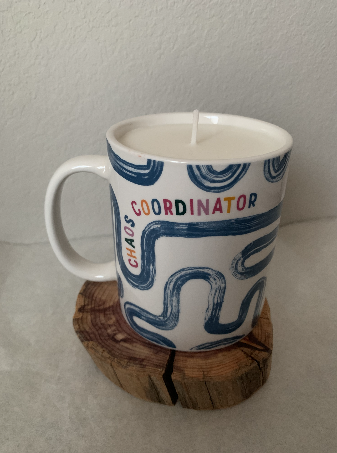 12 oz soy mug candle in a white and blue mug reading “Chaos Coordinator” and scented Vanilla and Hazelnut.