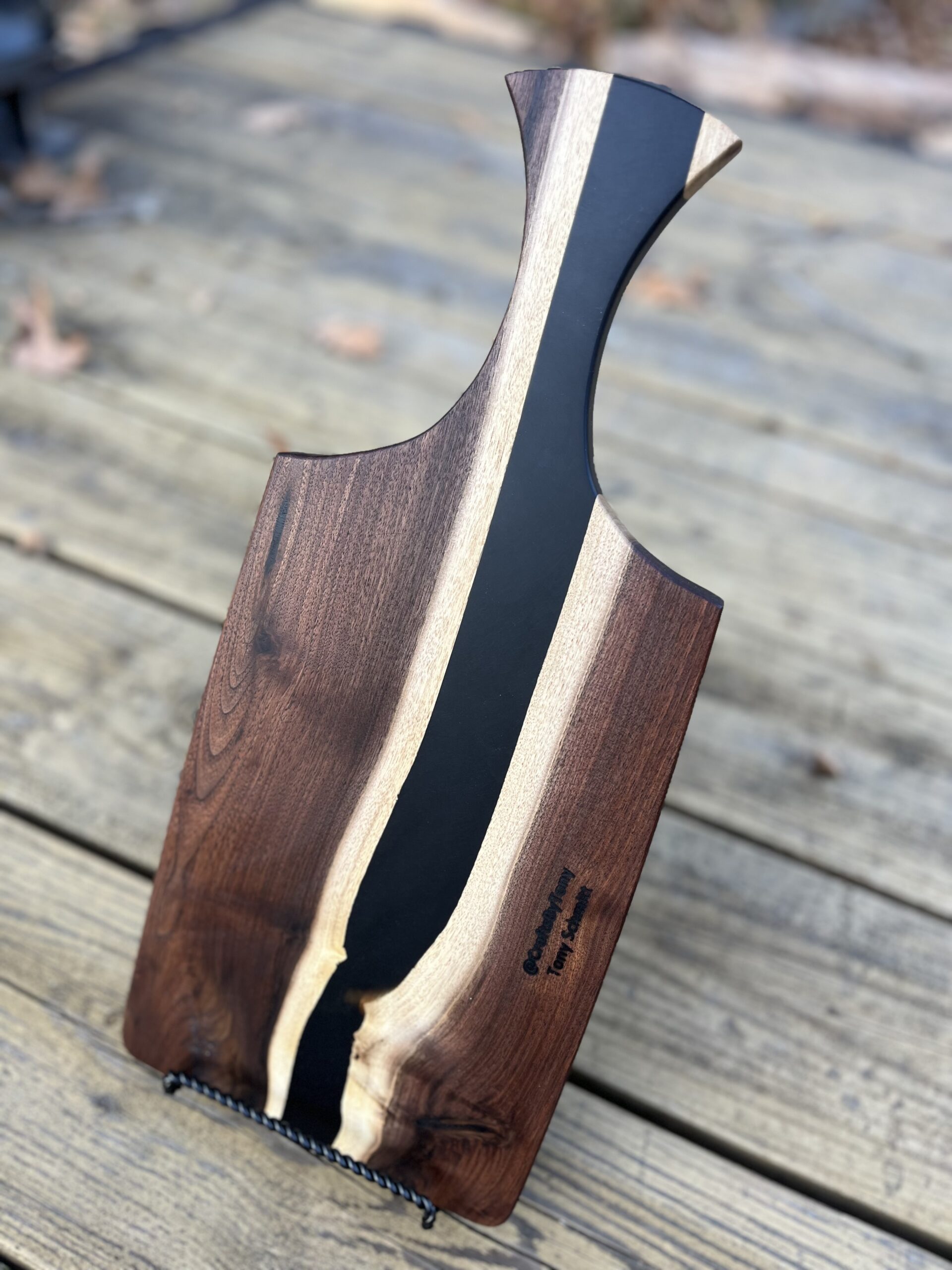Custom shape Charcuterie board made with a variety woods and color resin options. This one is made with Walnut and black resin. Option are only limited by one’s imagination, msg me for a custom piece.