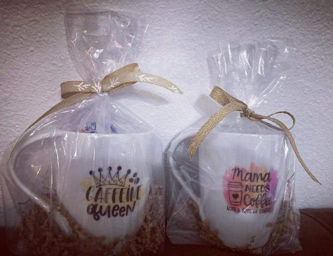 I created these coffee mugs with water slide transfer paper, baked them to seal the transfer paper, and sprayed them with a gloss spray. I have several prints to choose from. Each mug includes a caramel cappuccino coffee pod and chocolate.