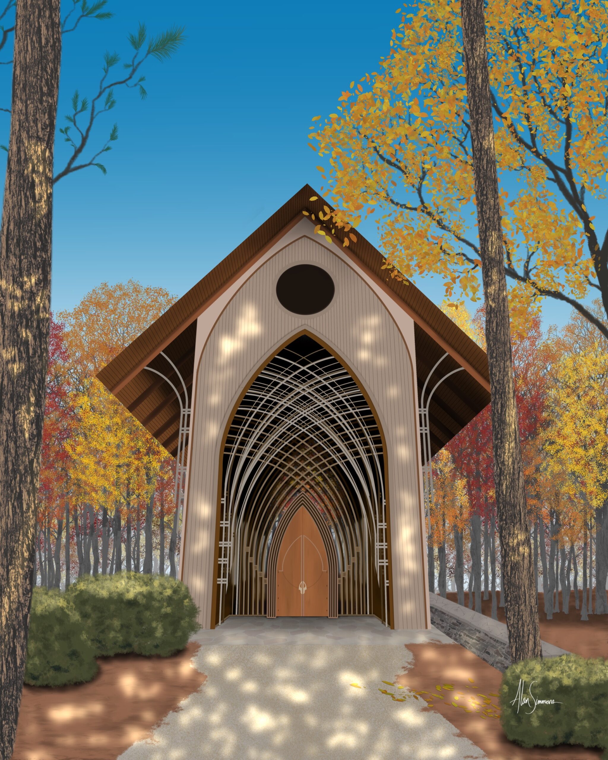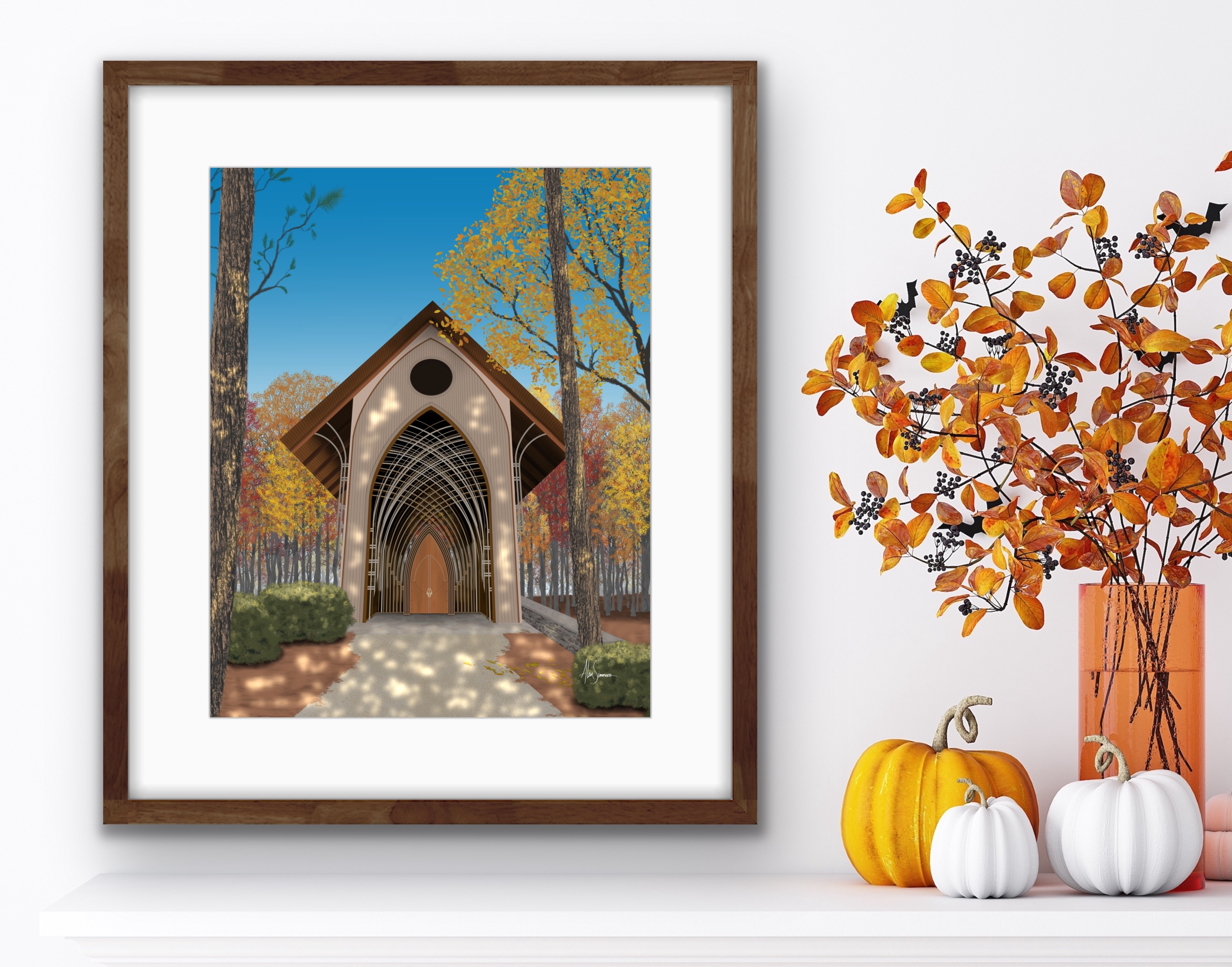 Cooper Chapel features an expansive view of the stunning architecture of the Mildred B. Cooper Chapel surrounded by colorful fall leaves and dappled sunlight, all under a crisp blue sky. Designed by architect E. Fay Jones and built in 1988, the chapel is nestled in the woods overlooking Lake Norwood in Bella Vista, Arkansas. Hand-drawn digital art. Prints available in 16 x 20, 8 x 10, and 5 x 7.