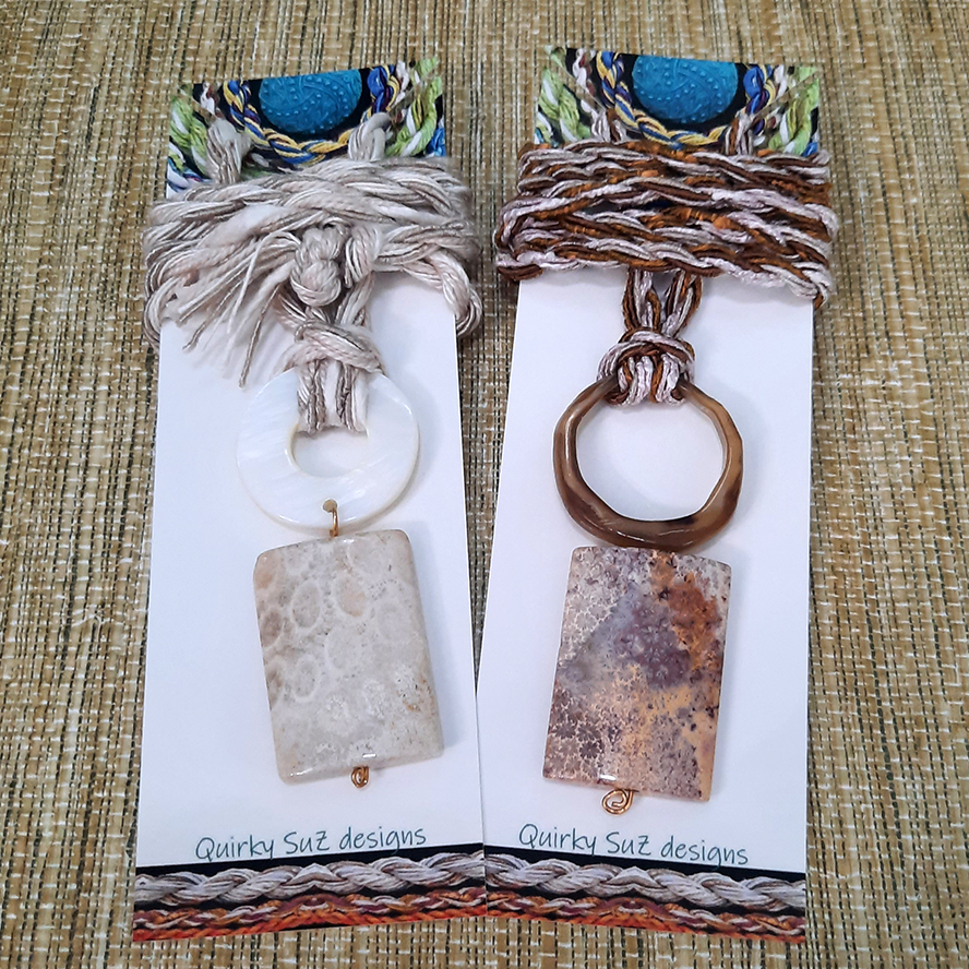 The coral rectangles have a lace-like design. Rings are shell & horn. I design the cords to have colors and textures that relate to the pendants.