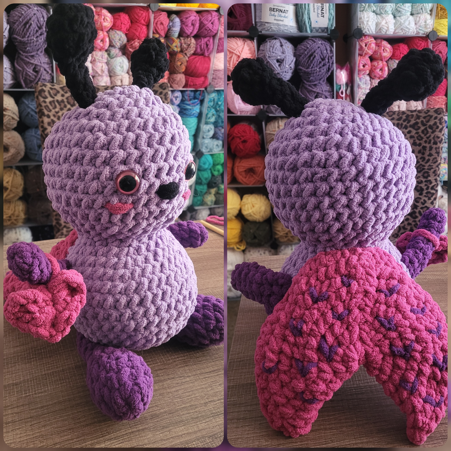 Meet Lovey the Love Bug! Lovey likes fluttering around spreading some love wherever she goes! Lovey has been lovingly crocheted, all the little details added (including felted eyes), and is firmly stuffed with poly-fil.