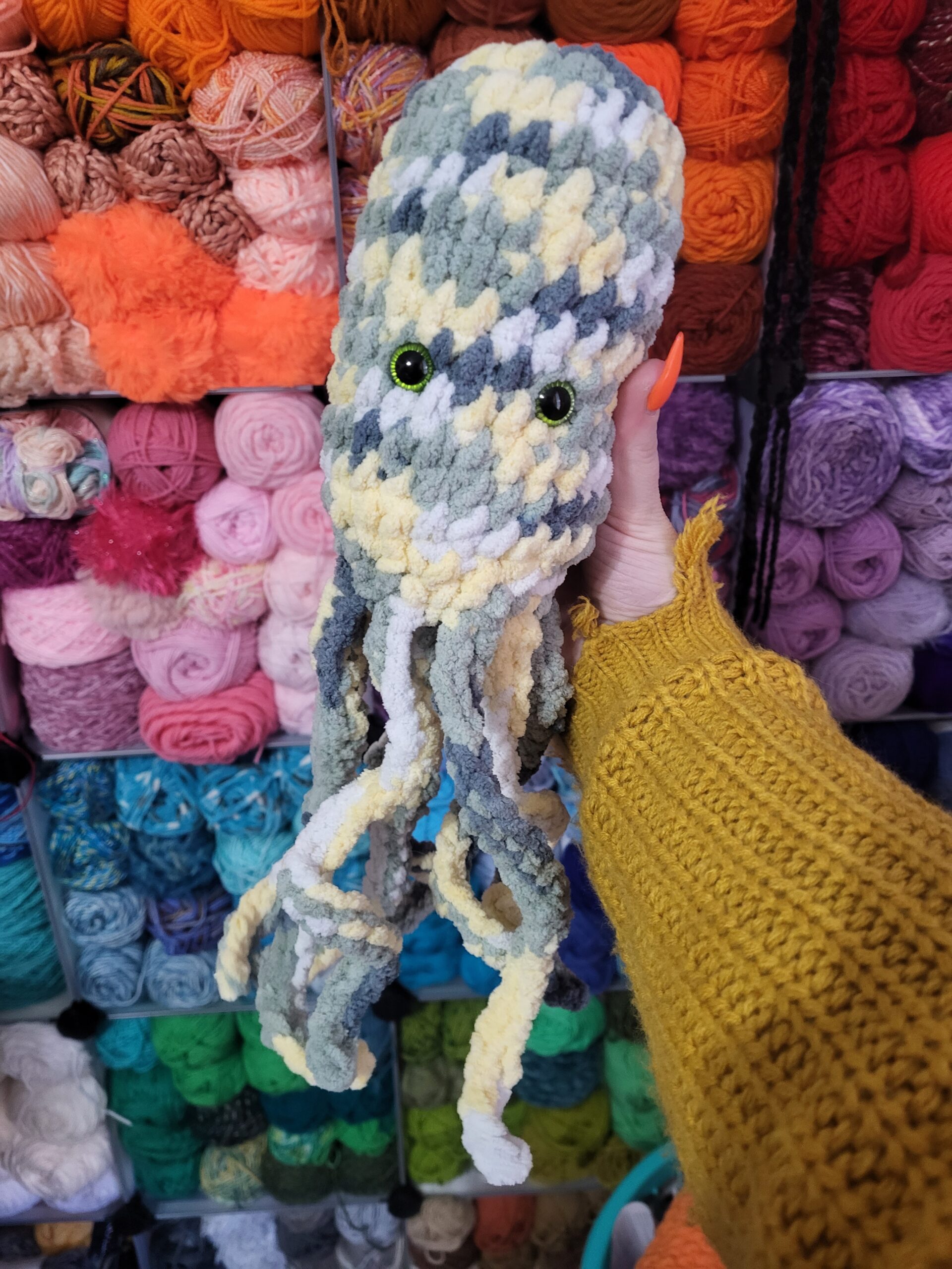 Meet Oscar the Octopus! Oscar loves floating about in the sea with all his friends! Oscar has been lovingly crocheted, all the little details added (including felted eyes), and is firmly stuffed with poly-fil.