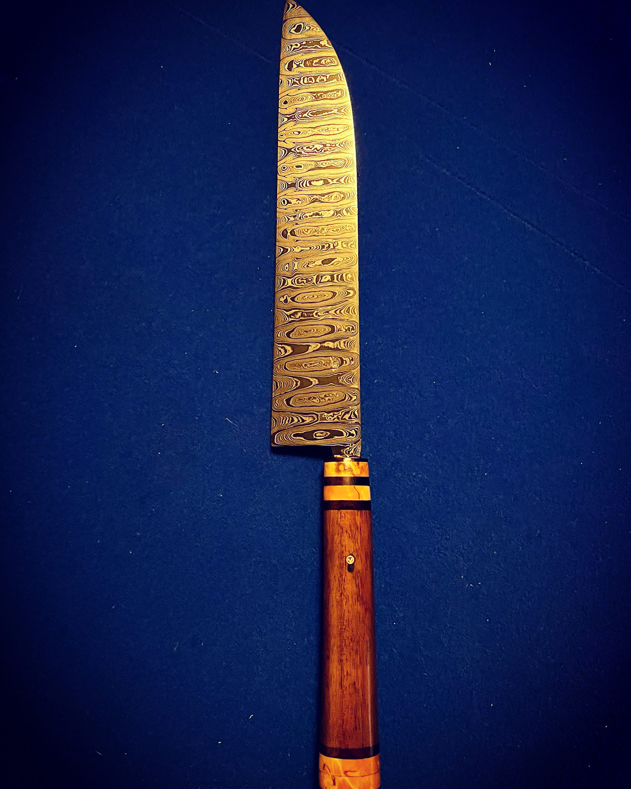 Damascus Gyuto with custom hidden tang handle made from 10 separate pieces of wood; walnut, cocobolo and masur birch 😎🔪
