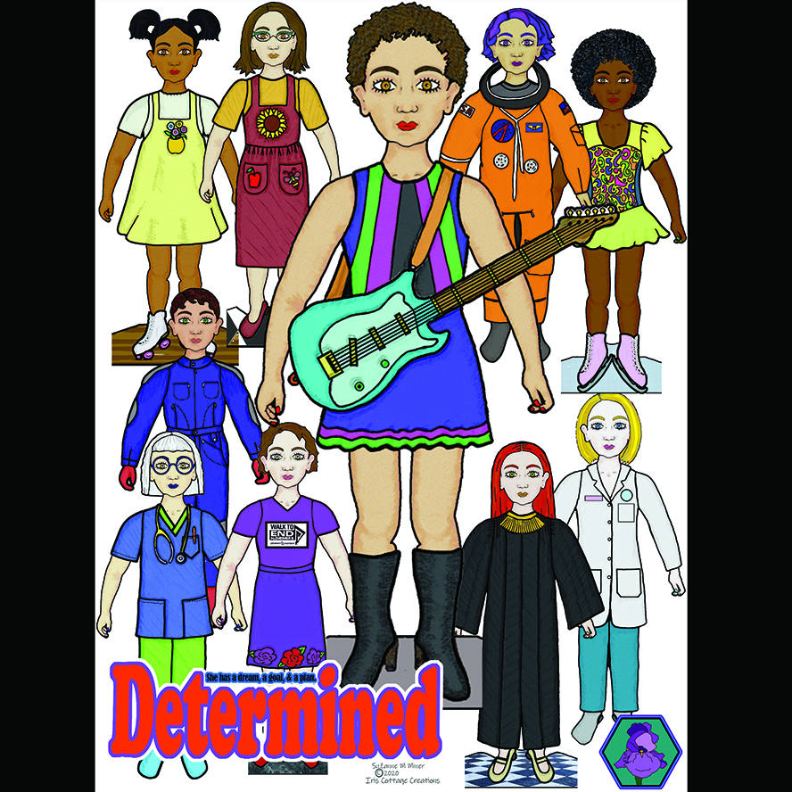 “Determined” the paper doll was inspired by a picture of a little girl standing proudly in her roller skates and cute dress. The girl’s stance and expression made me think of determination. I decided that my girl would have the pose from the photo but have many styles of hair and a variety of skin tones. Creating diversity in paper dolls and coloring books might sound silly to some, but it’s important to me.