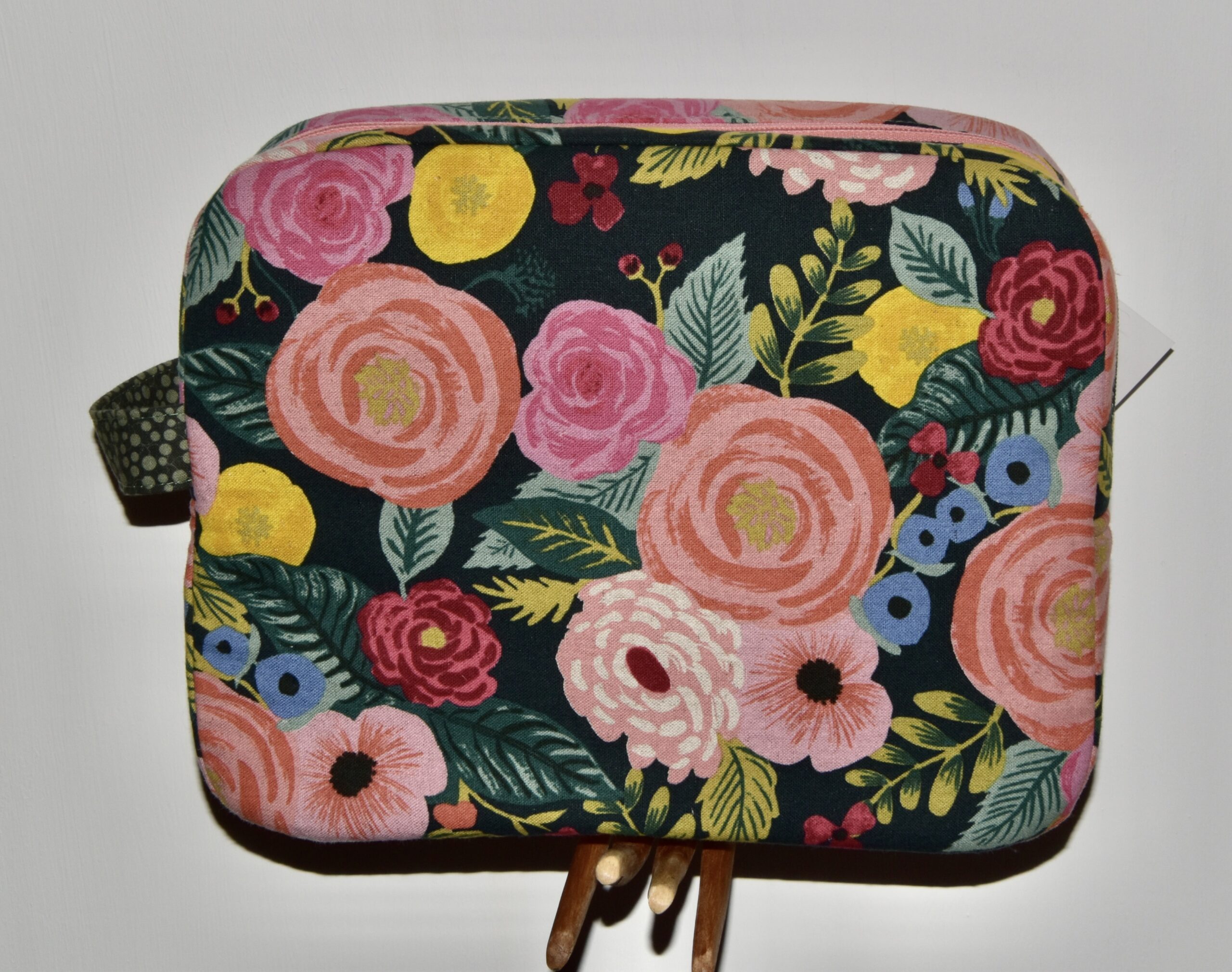 This bag has two separate zippers which when opened reveal two separate pouches. It is fully lined on the inside and is constructed with 1/4″ foam interfacing to give it support and structure. The pouch measures approximately 10 1/2″ long, 8 1/2″ tall and 3 1/2″ wide.