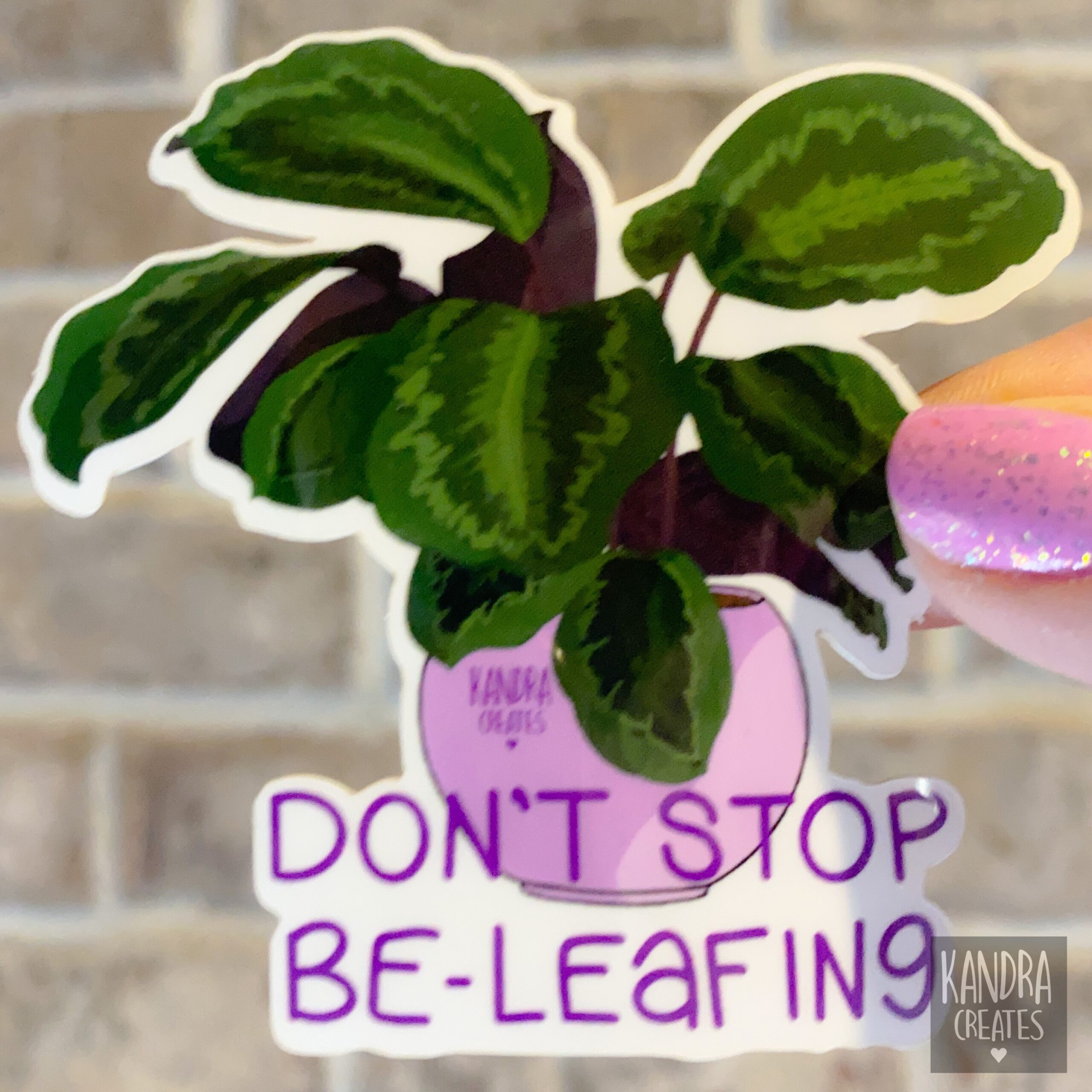 This sticker of a Calathea plant, also known as a prayer plant reminds you to don’t stop be-leafing! This weatherproof and waterproof vinyl sticker has a glossy finish and features a Calathea plant with the pun “Don’t Stop Be-Leafing”.