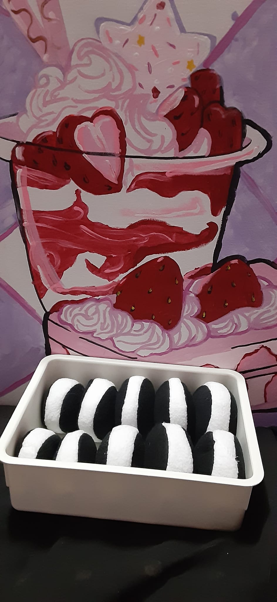 I made these plushies to try and test out making cookie plushies. So I went with an oreo style design. They are called dream cookies, due to my shop/booth name having the name dream in it and they are soft like pillows.