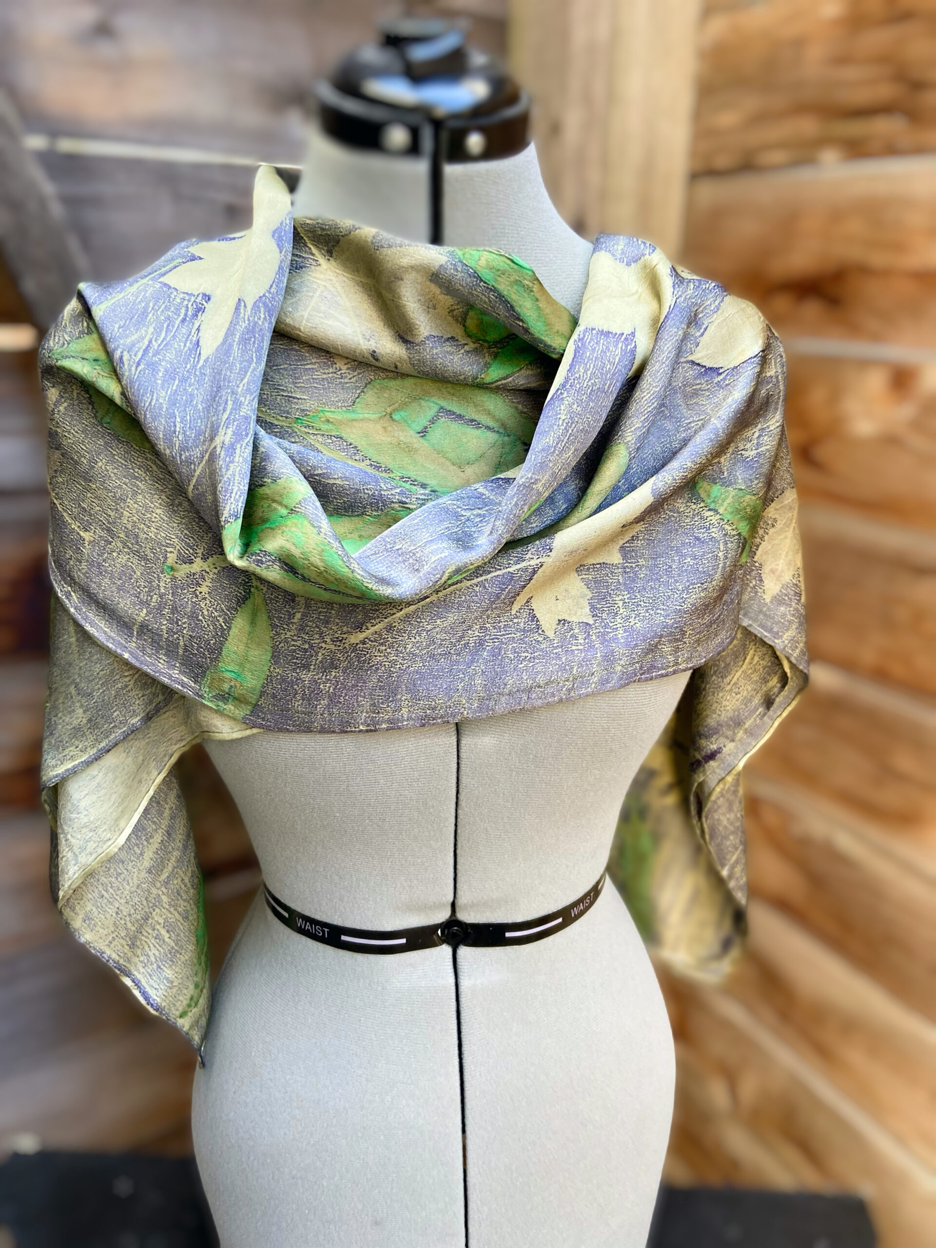 The process I use to create these one of a kind scarves is all done by hand. First I mordant the fabric to ensure that the natural dyes and tannins in the plants will adhere to the fabric permanently. I then lay out the leaves onto the scarf. I put a blanket that has been soaked in another plant material on top of the scarf. Then the scarf gets rolled onto a pipe and steamed for a few hours. When the bundle is cool enough to handle, I unwrap it and wash it in pH balanced soap and cold water. I then press the scarf with my iron set on “Silk”.