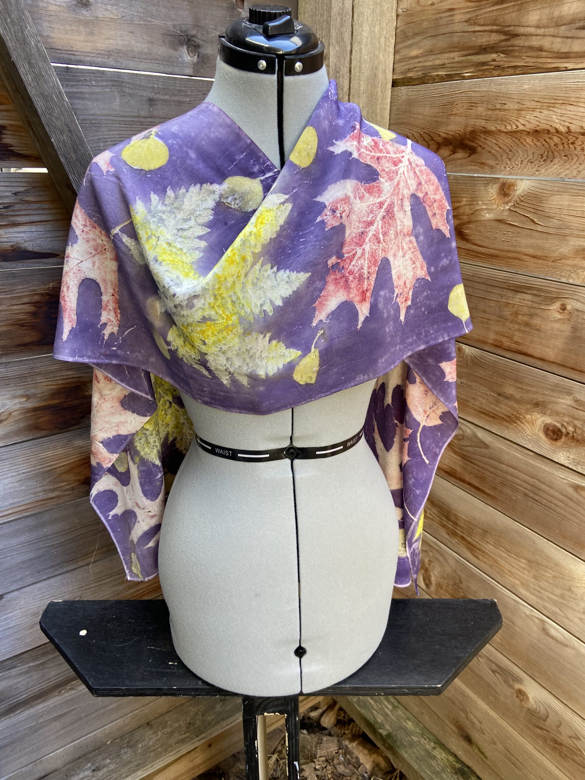 The process I use to create these one of a kind scarves is all done by hand. First I mordant the fabric to ensure that the natural dyes and tannins in the plants will adhere to the fabric permanently. I then lay out the leaves onto the scarf. I put a blanket that has been soaked in another plant material on top of the scarf. Then the scarf gets rolled onto a pipe and steamed for a few hours. When the bundle is cool enough to handle, I unwrap it and wash it in pH balanced soap and cold water. I then press the scarf with my iron set on “Silk”.