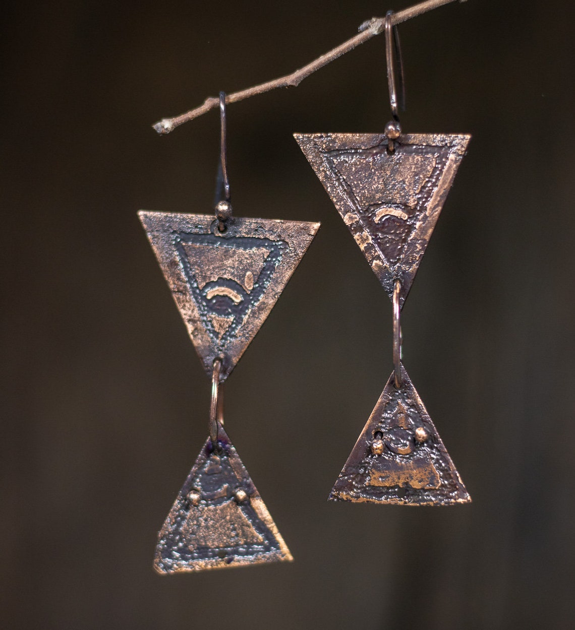 Solid Copper earrings with aged patina and etched design. 2 inches long and 1 inch wide.