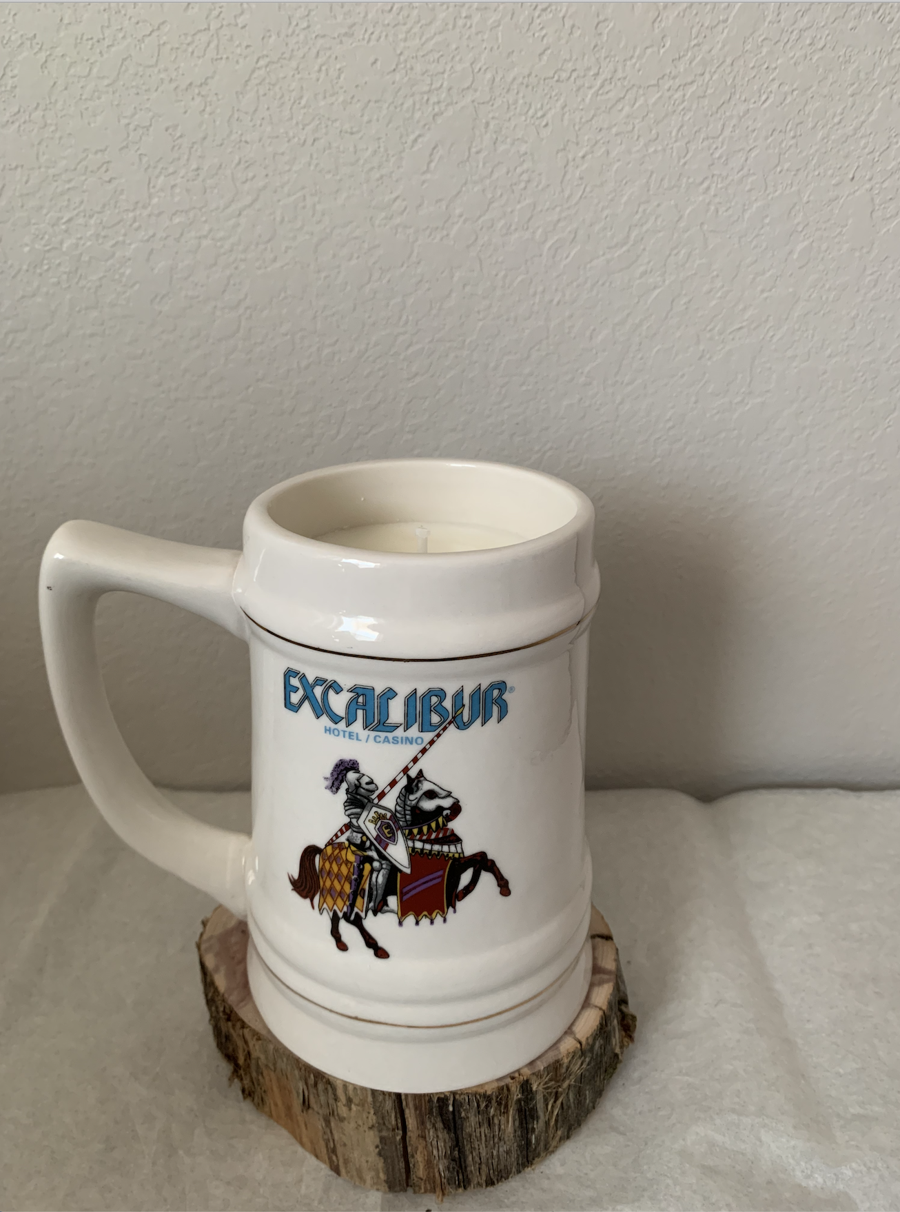 White mug candle with “Excalibur Hotel/Casino” logo. Made with soy wax and contains hints of Vanilla and Hazelnut. 16 oz candle.
