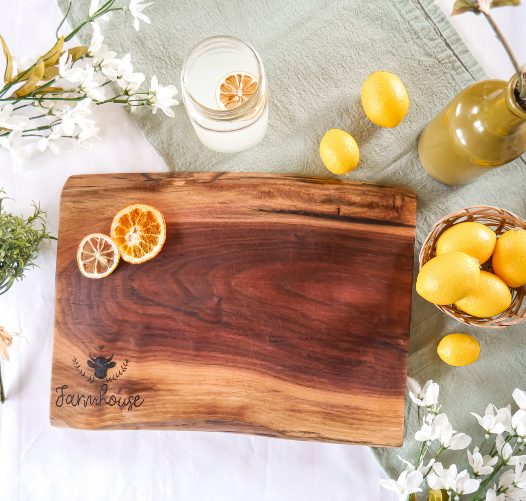 This Farmhouse Live Edge Chopping board would make a thoughtful and memorable gift for anyone in your life. You can also use them in your home as a charcuterie board or as decoration.