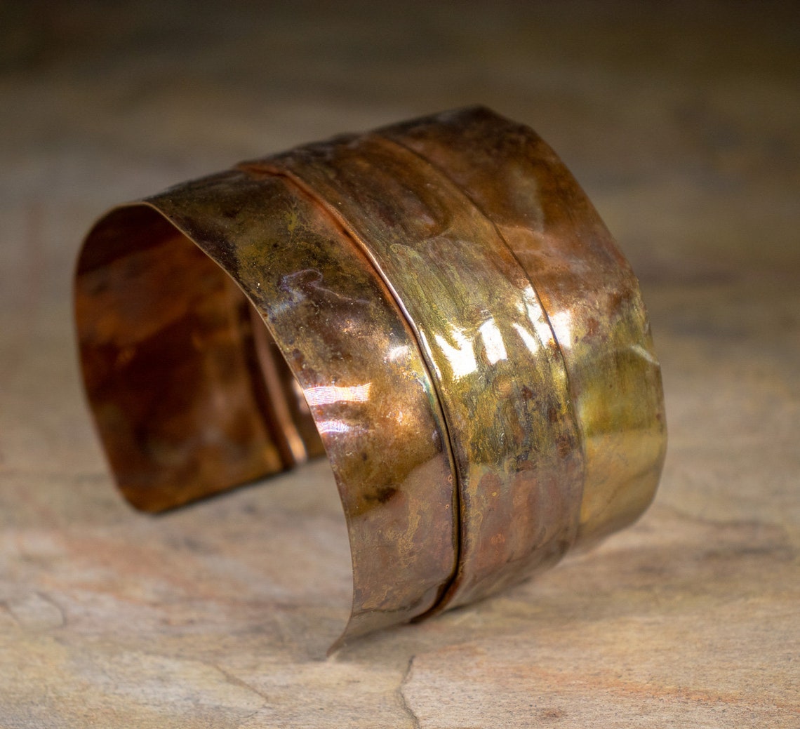 This solid copper cuff was created by David using a fold forming technique where the metal is heated, then folded and hammered to achieve the desired design. It is colored with a aged patina and sealed to protect the finish. Bracelet length: 6 Inches; Bracelet width: 3 Inches. One size fits most.