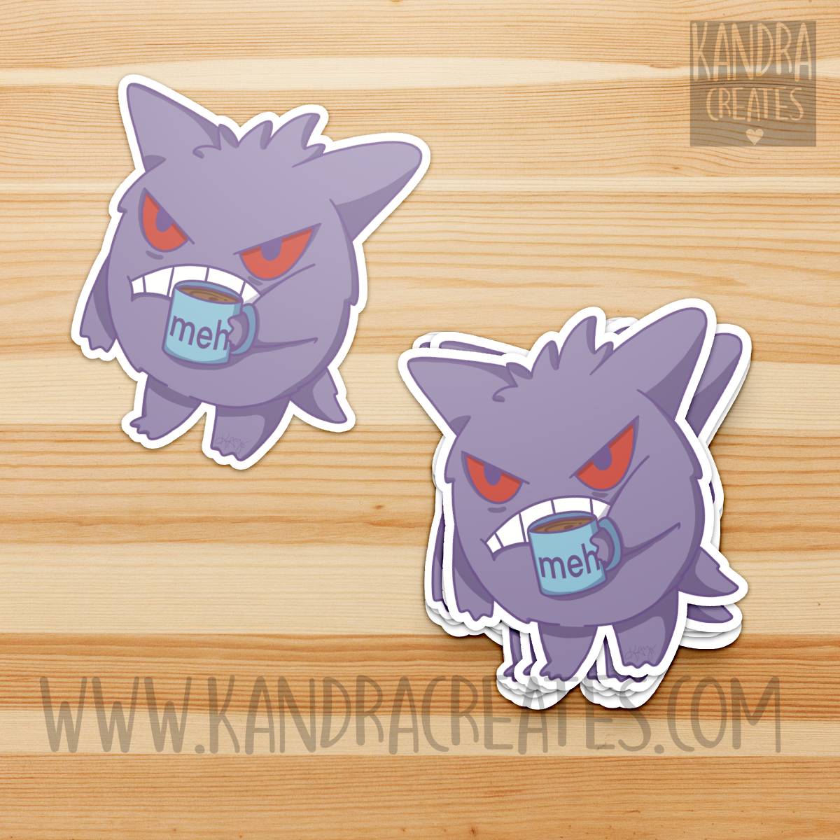 Gengar is not a morning person. This weatherproof and waterproof vinyl sticker has a glossy finish and features fan art of the pokemon Gengar with bags under his eyes, an annoyed face and a holding a coffee mug that says “Meh”. This is a companion sticker to Clefairy Mornings.