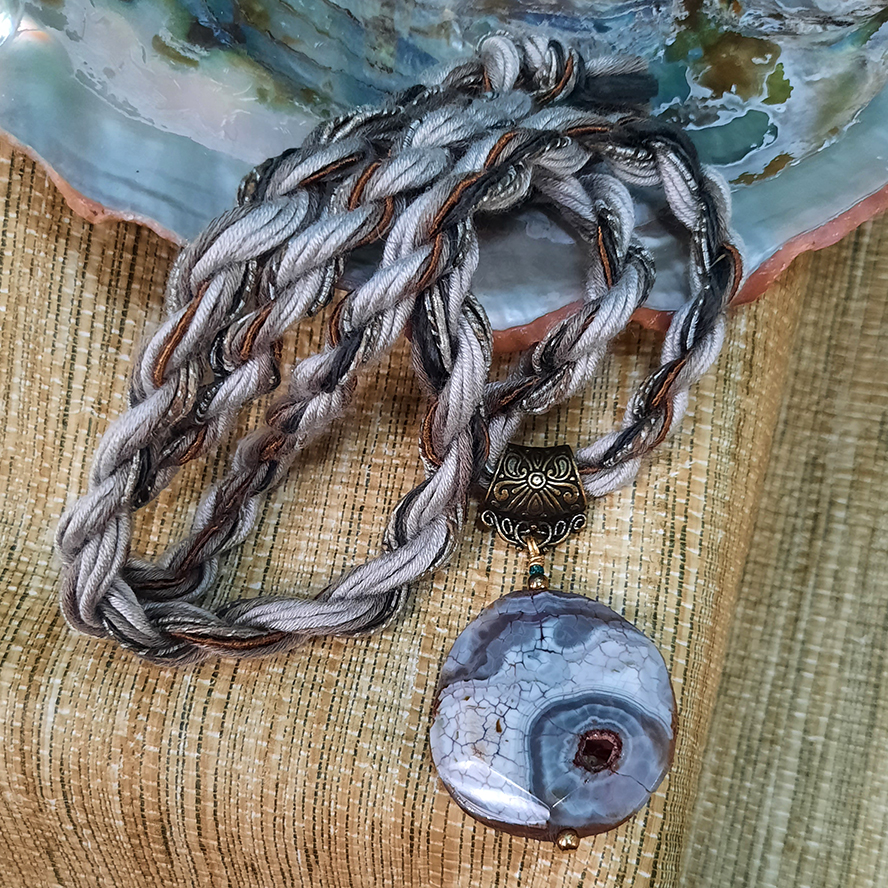 This interesting stone made me think of friends who collect stones with holes in them. It called for a fancier cord than most in the collection. I like the combination of colors and textures.