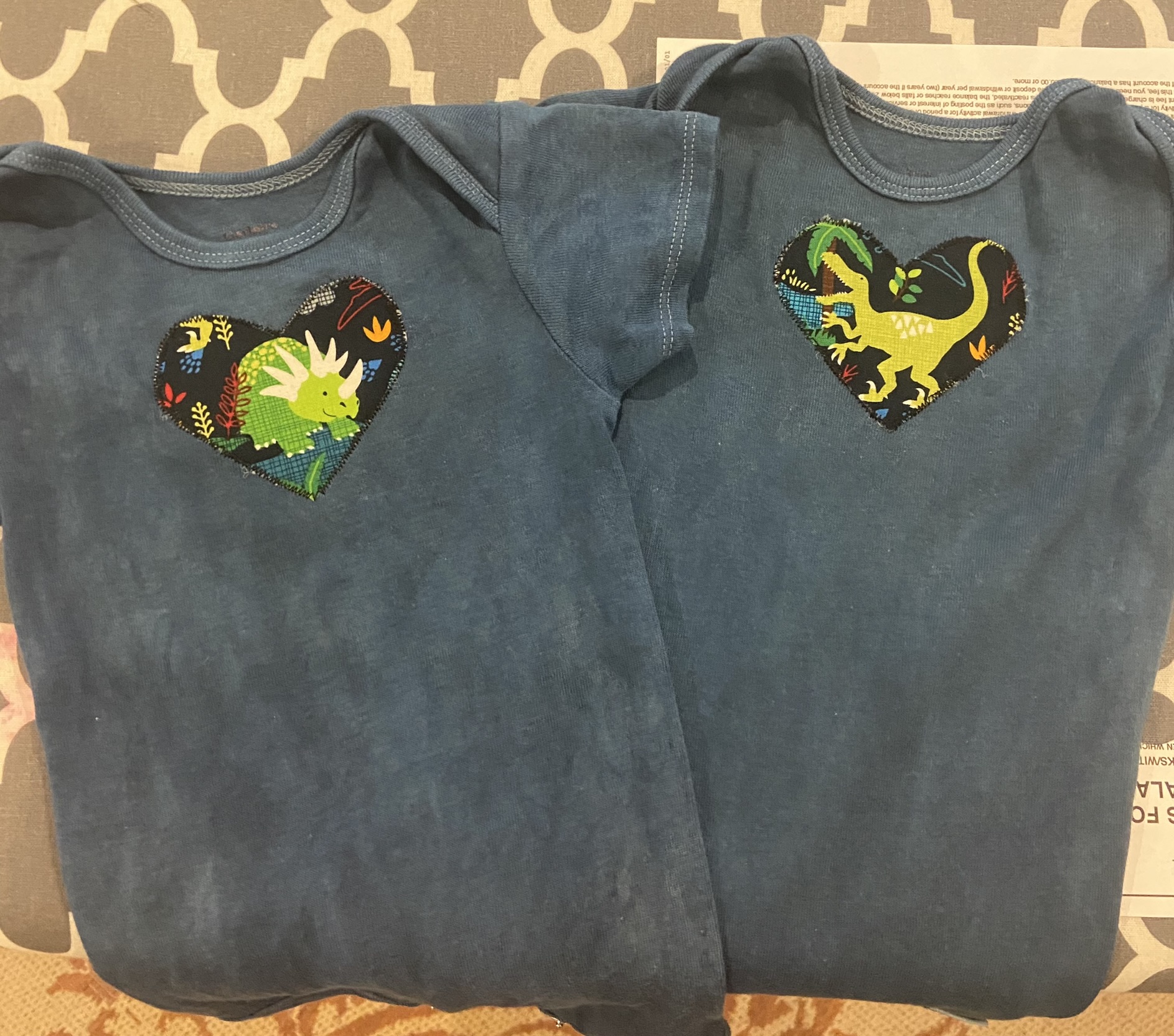 Each baby onesie has been indigo-dyed then appliqued with a dinosaur heart. Each onesie is Size 12 months.