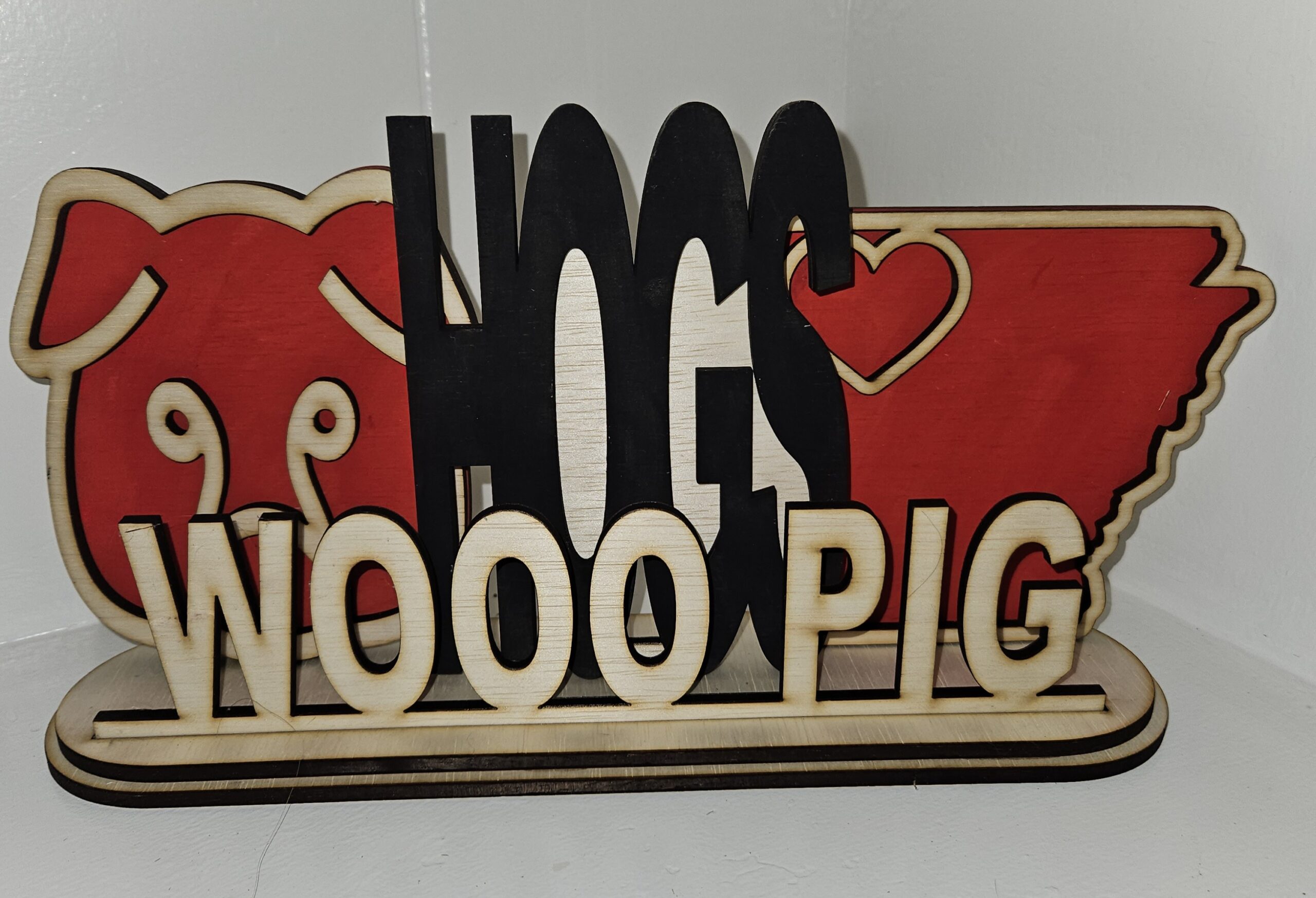 Part of the interchangeable decor for tabletop/shelf home decorations. This one features the hogs!